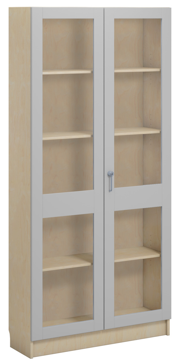 Materiaalikaappi laminaattirungolla. Ovet laminaattia tai korkeapainelaminaattia. Ovissa vanerikuvioinen reunanauha. 2 lasiovea turvalasilla, joissa spanjoletti lukot. 170 astetta kääntyvät saranat. Kaksi avainta. Sisällä 5 hyllytasoa joista 3 siirettäviä.