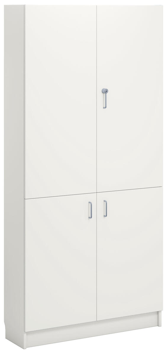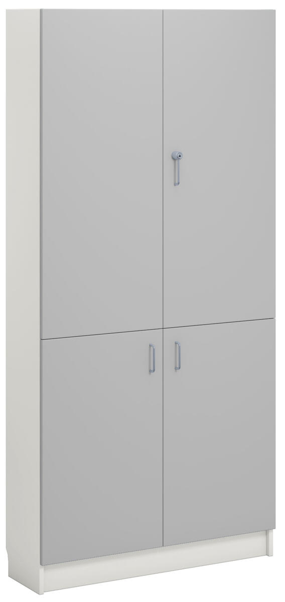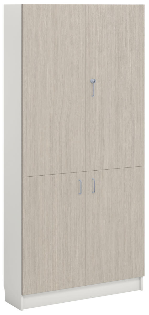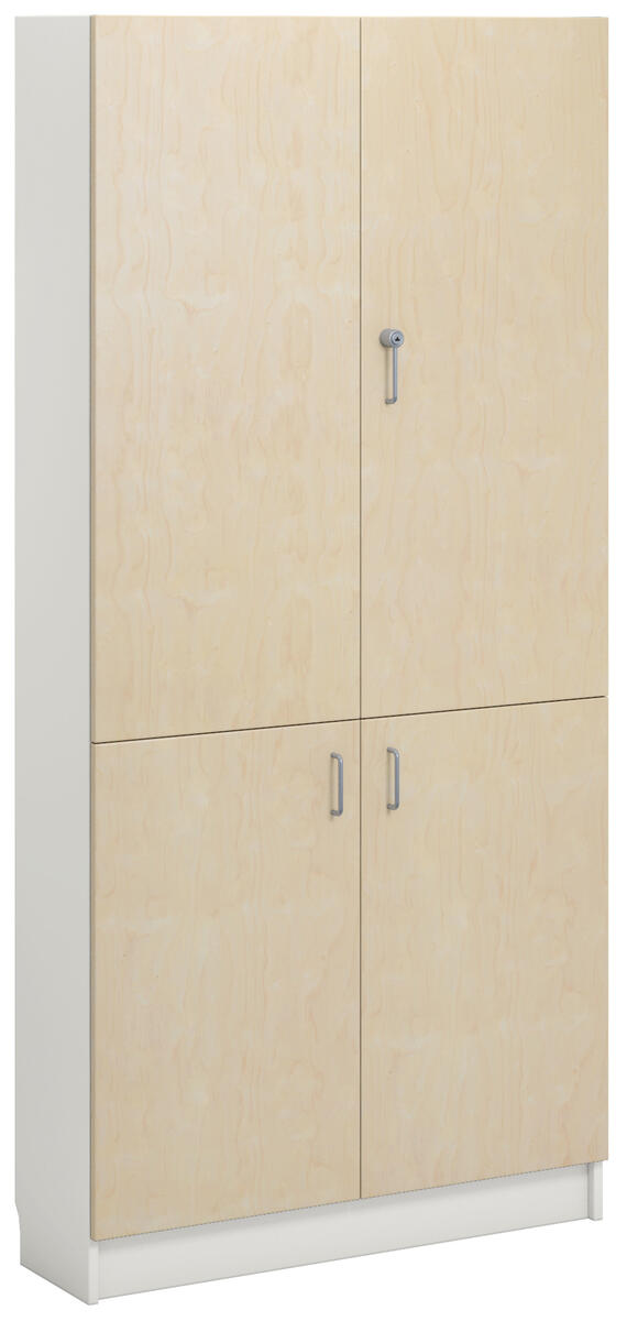 Materiaalikaappi laminaattirungolla. Ovet laminaattia tai korkeapainelaminaattia. Ovissa vanerikuvioinen reunanauha. 2 lasiovea turvalasilla, lukolla (sis. 2 avainta), ja 2 umpiovea, joissa vetimet. 170 astetta kääntyvät saranat. Kaksi avainta. Sisällä 5 hyllytasoa joista 3 siirettäviä.