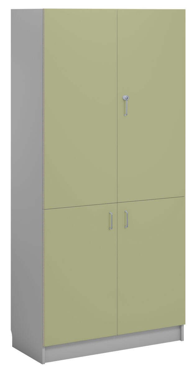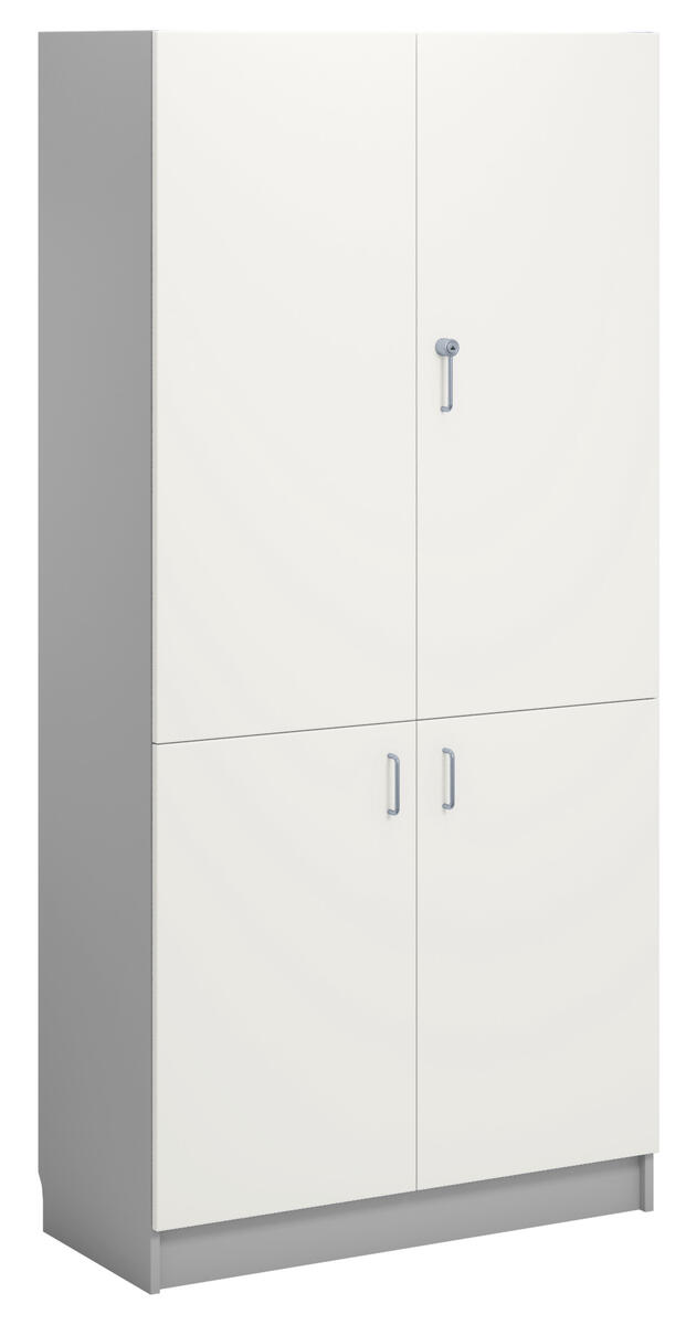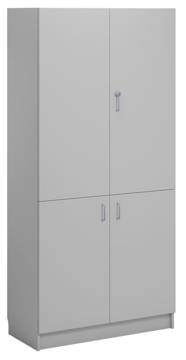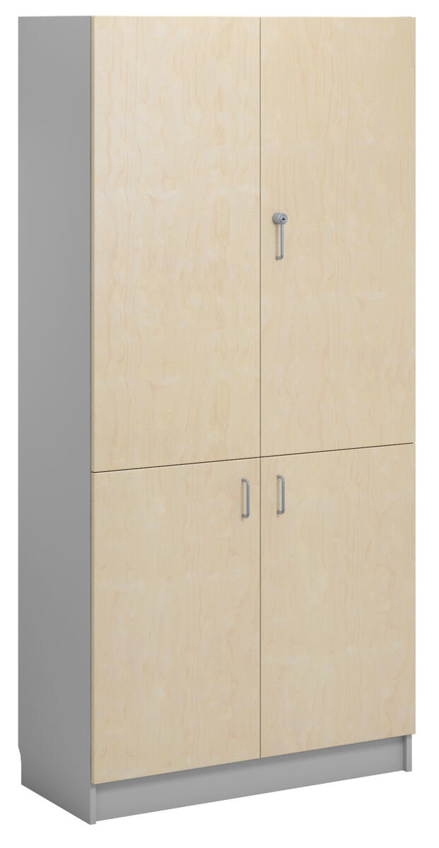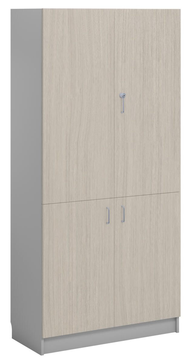 Materiaalikaappi laminaattirungolla. Ovet laminaattia tai korkeapainelaminaattia. Ovissa vanerikuvioinen reunanauha. 2 lasiovea turvalasilla, lukolla (sis. 2 avainta), ja 2 umpiovea, joissa vetimet. 170 astetta kääntyvät saranat. Kaksi avainta. Sisällä 5 hyllytasoa joista 3 siirettäviä.