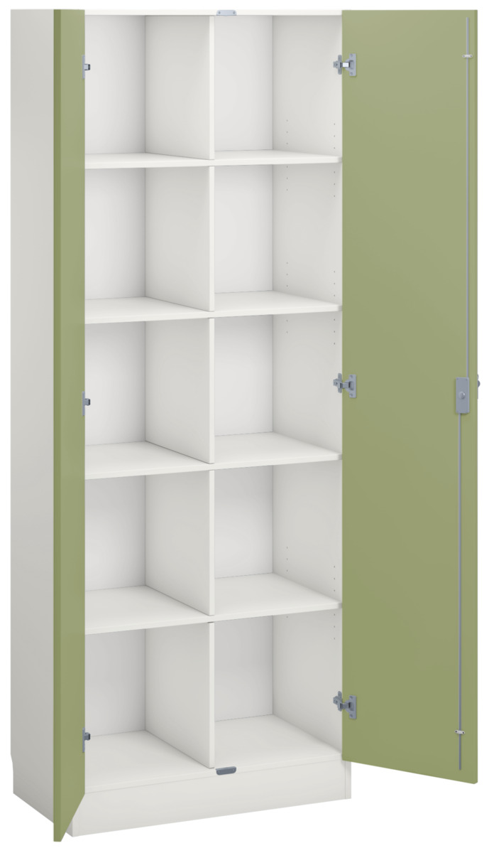 Materiaalikaappi laminaattirungolla. Ovet laminaattia tai korkeapainelaminaattia. Ovissa vanerikuvioinen reunanauha. Ovissa spanjoletti lukot sekä 170 astetta kääntyvät saranat. Kaksi avainta. Sisällä 5 hyllytasoa joista 3 siirrettäviä.