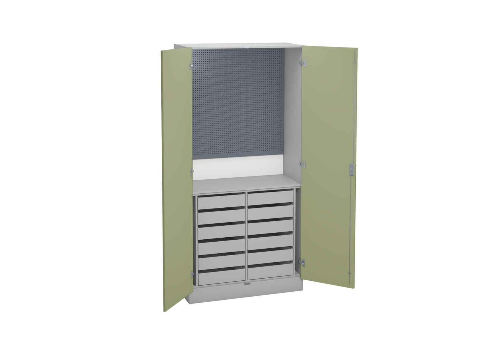 Puu- ja metallityökaappi laminaattirungolla. Ovet laminaattia tai korkeapainelaminaattia. Ovissa vanerikuvioinen reunanauha. 2 umpiovea, joissa spanjoletti lukot. 170 astetta kääntyvät saranat. Kaksi avainta. Sisällä reikälevytausta, sisältää 5 koukkua, talttapidikkeen sekä listan, jossa jousipidikkeitä. 12 vetolaatikkoa.