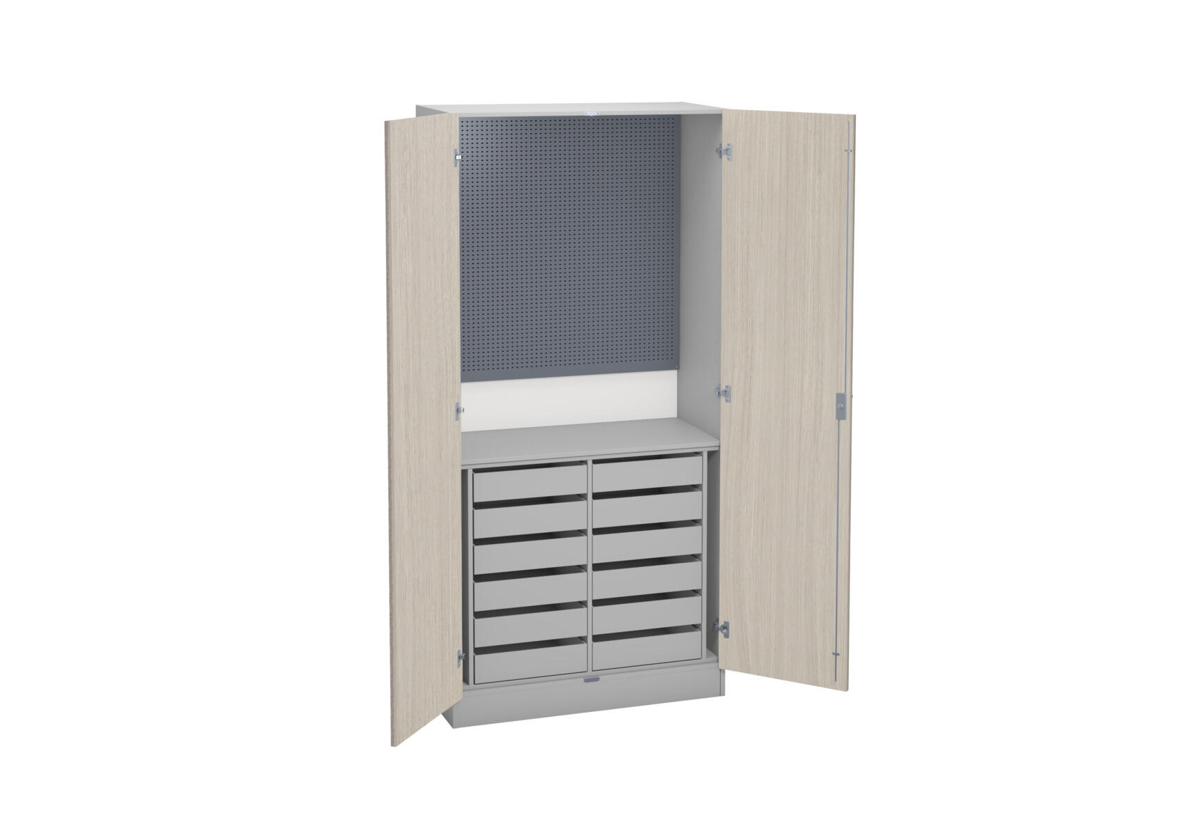 Työkalukaappi puu- ja metallityöhön. Runko laminaattia. Ovet laminaattia tai korkeapainelaminaattia. Ovissa vanerikuvioinen reunanauha. 2 umpiovessa 170 asteen saranat ja spanjoletti lukko. Kaksi avainta. Sis.12 laatikkoa teleskooppiliu'ulla. Reikälevy taustalla, sisältää 5 koukkua, talttapidikkeen sekä listan, jossa jousipidikkeitä. Ei sisällä työkaluja.