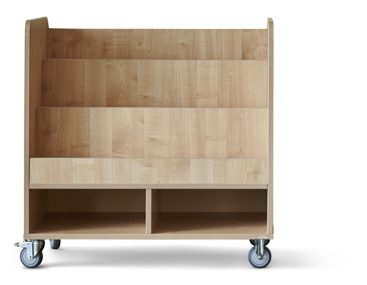 Kirjavaunussa on 4 kaksoispyörää, joista kaksi on lukittavia. Toimituksen yhteydessä koottu. Sivuilla on kolme A4-kokoista muovikoteloa ja kolme hyllytasoa. Kirjavaunu on valmistettu 18 mm lastulevystä, jossa laminaattipinta ja vanerikuvioitu reunanauha. Vaunun kokonaiskorkeus on 120 cm, leveys ja syvyys 60 cm. Pohjalevyn koko on 69x69 cm. Hyllytasojen leveys ja syvyys 27 cm, hyllyjen välinen korkeus on 35 cm. Lattian ja pohjalevyn yläreunan välinen korkeus on 10 cm.