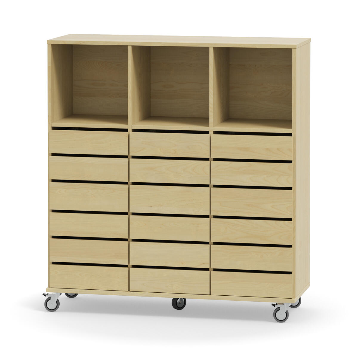Oppilassäilytin, joka rakennetaan oman tarpeen mukaan ja toimitetaan valmiiksi koottuna. Rungoissa on esiporatut reiät kaikkia yhdistelmiä varten. Tässä rungossa on pyörät ja kuusi avolokeroa, sekä 4,5 cm syvempi pohjalevy, jotta säilytin olisi tukevampi. Kuudesta pyörästä kaksi on kääntyviä ja lukittavia. Toisen päädyn pyörät on kiinteät, jotta säilyttimen siirtäminen olisi vakaata. Lokeroihin voi valita ovet tai laatikot, tai ne voi käyttää sellaisenaan. Ovia on oikean- ja vasenkätisinä, pieniä ja isoja. Ovien ja laatikoiden etusarjat tulevat rungon eteen, ja niiden yläpuolelle jää pieni rako, joka toimii postiluukkuna. Rako toimii myös vedinkolona ovissa ja laatikoissa. Lokeron sisämitta: L37 S38 K38 cm. Materiaalina 18 mm lastulevy, jossa laminaattipinnoite. Etusarjoissa vanerikuvioitu abs-reunanauha. Jaloilla ja sokkelilla varustetut säilyttimet tulee kiinnittää seinään paketissa olevilla seinäkiinnikkeillä. Ruuvit ei sisälly. Jalat, sokkeli ja pyörät ovat 10 cm korkeat. Lisävalintana peili- tai valkotaulutausta.