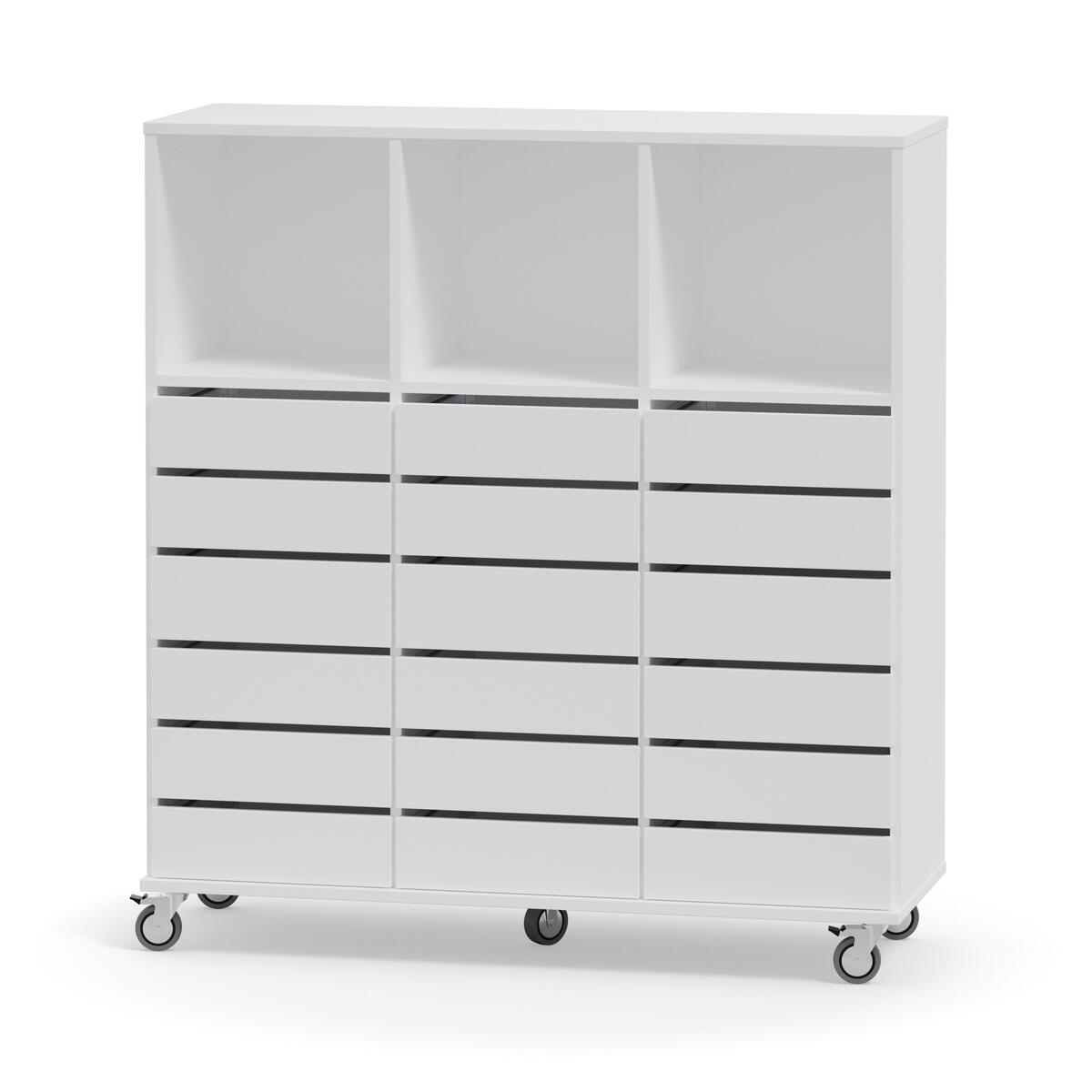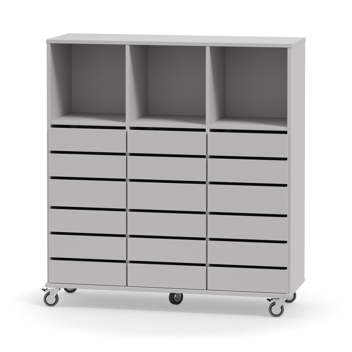 Säilytyskaluste, jossa Gratnellin laatikot. Valittavana pyörät, jalat tai sokkeli. Kuudesta pyörästä kaksi on kiinteitä, mikä tekee säilytyksestä vakaan siirrettäessä. Vapaasti liikkuvat pyörät ovat lukittavia. Materiaali: 18 mm lastulevyä, jossa on laminaattipinta ja ABS-reunanauha. Runko jaloilla ja sokkelilla tulee kiinnittää seinään mukana tulevilla seinäkiinnikkeillä. Ruuvit eivät sisälly toimitukseen. Laatikoiden kiskoissa on pysäyttimet. Laatikon mitat: L31,2 S42,7 K15 cm. Laatikon väri valittavissa.