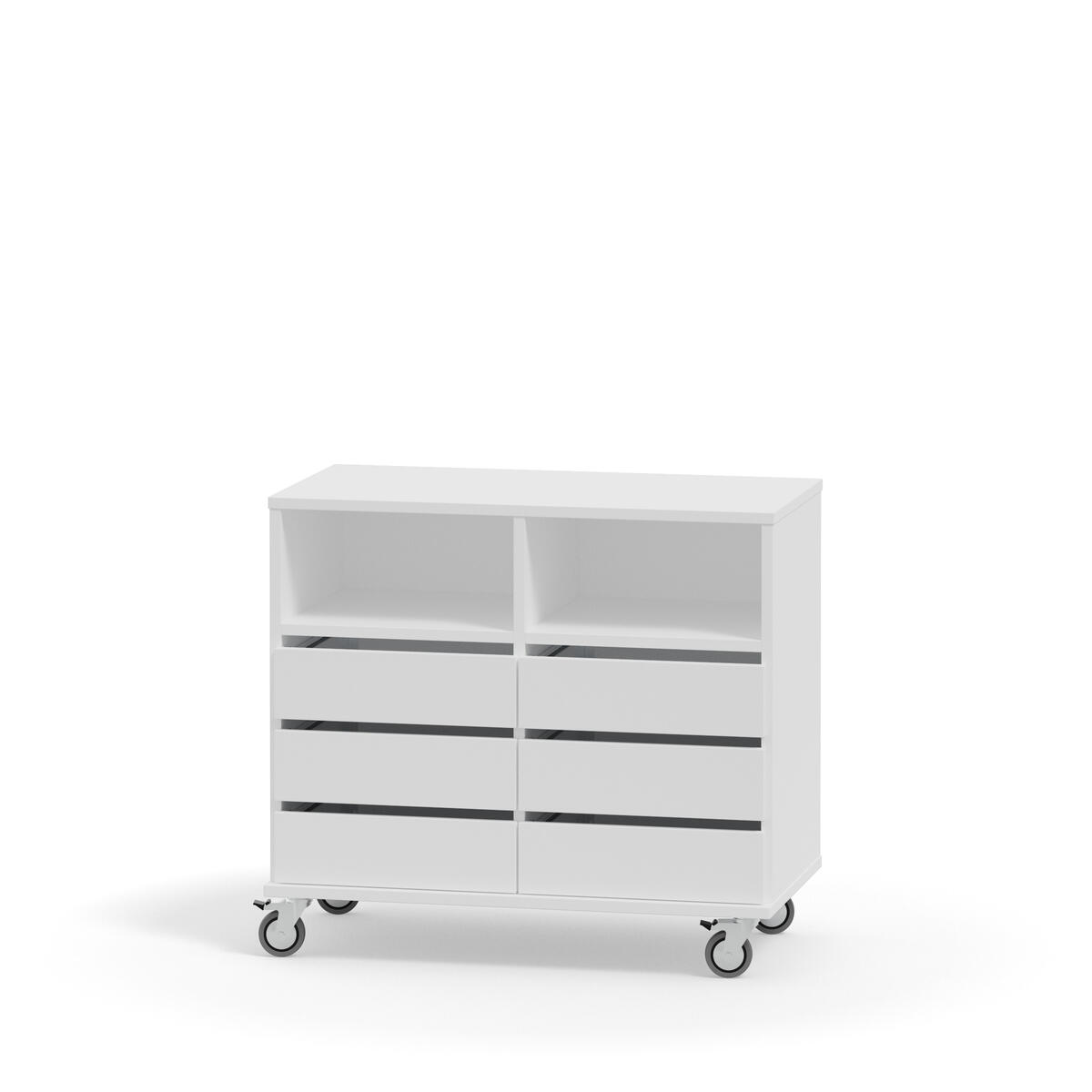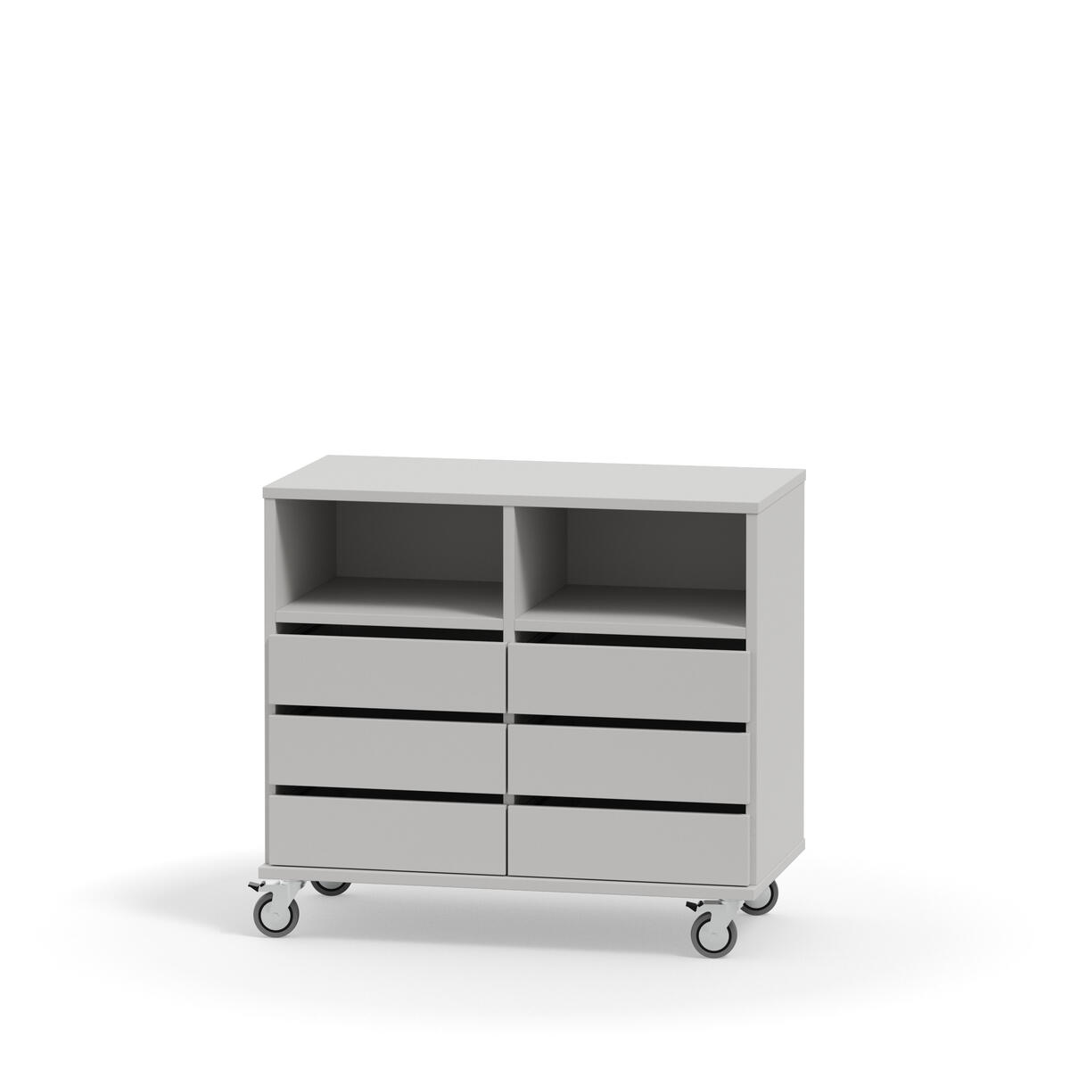 Säilytyskaluste, jossa Gratnellin laatikot. Valittavana pyörät, jalat tai sokkeli. Kuudesta pyörästä kaksi on kiinteitä, mikä tekee säilytyksestä vakaan siirrettäessä. Vapaasti liikkuvat pyörät ovat lukittavia. Materiaali: 18 mm lastulevyä, jossa on laminaattipinta ja ABS-reunanauha. Runko jaloilla ja sokkelilla tulee kiinnittää seinään mukana tulevilla seinäkiinnikkeillä. Ruuvit eivät sisälly toimitukseen. Laatikoiden kiskoissa on pysäyttimet. Laatikon mitat: L31,2 S42,7 K7,5 cm. Laatikon väri valittavissa.