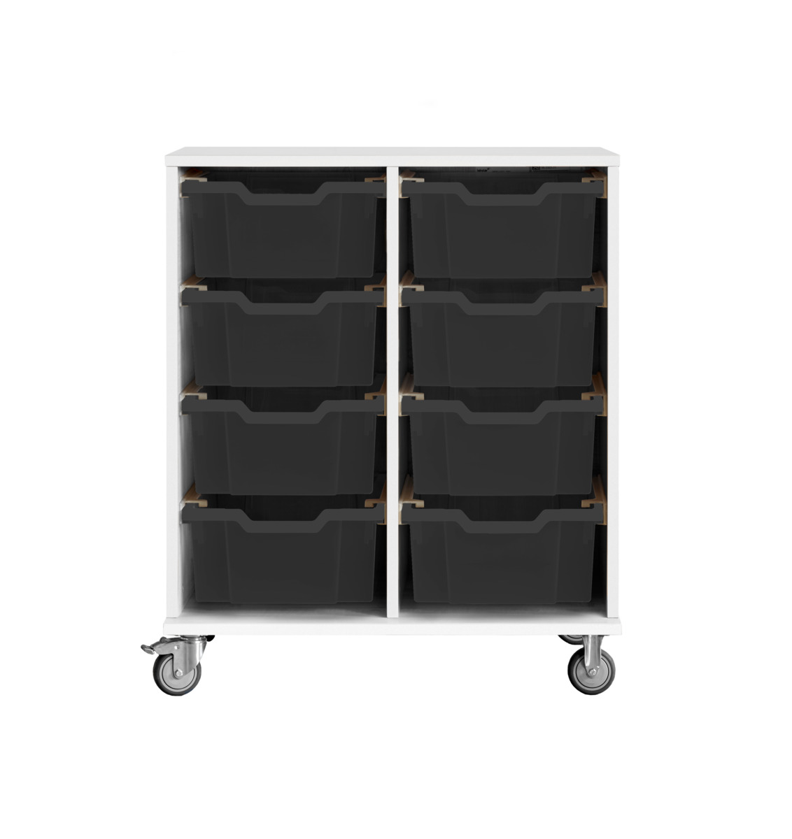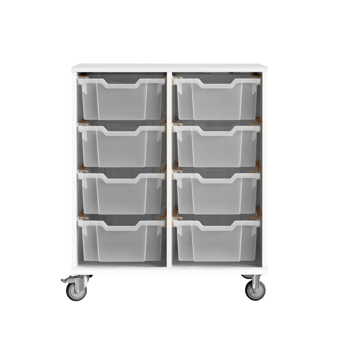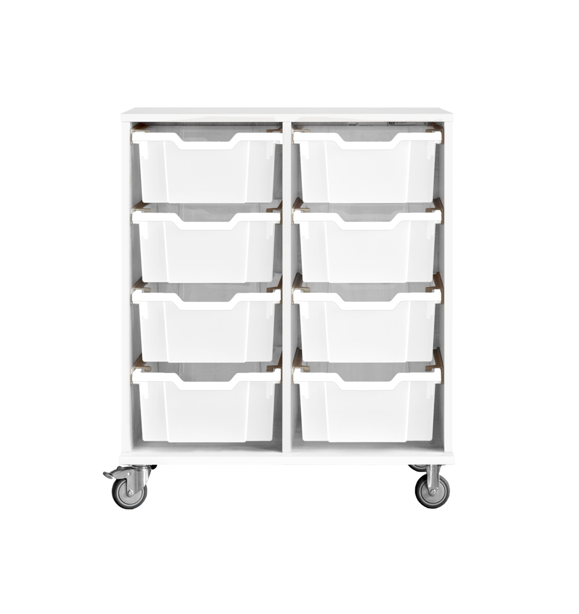 Säilytyskaluste, jossa Gratnellin laatikot. Valittavana pyörät, jalat tai sokkeli. Kuudesta pyörästä kaksi on kiinteitä, mikä tekee säilytyksestä vakaan siirrettäessä. Vapaasti liikkuvat pyörät ovat lukittavia. Materiaali: 18 mm lastulevyä, jossa on laminaattipinta ja ABS-reunanauha. Runko jaloilla ja sokkelilla tulee kiinnittää seinään mukana tulevilla seinäkiinnikkeillä. Ruuvit eivät sisälly toimitukseen. Laatikoiden kiskoissa on pysäyttimet. Laatikon mitat: L31,2 S42,7 K15 cm. Laatikon väri valittavissa.