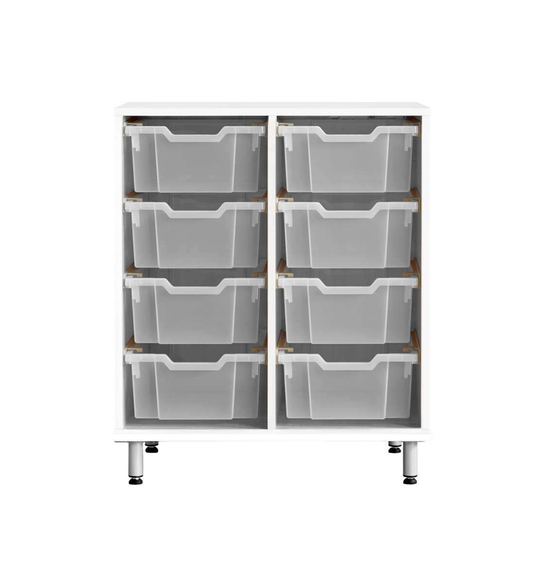 Säilytyskaluste, jossa Gratnellin laatikot. Valittavana pyörät, jalat tai sokkeli. Neljästä pyörästä kaksi on kiinteitä, mikä tekee säilytyksestä vakaan siirrettäessä. Vapaasti liikkuvat pyörät ovat lukittavia. Materiaali: 18 mm lastulevyä, jossa on laminaattipinta ja ABS-reunanauha. Runko jaloilla ja sokkelilla tulee kiinnittää seinään mukana tulevilla seinäkiinnikkeillä. Ruuvit eivät sisälly toimitukseen. Laatikoiden kiskoissa on pysäyttimet. Laatikon mitat: L31,2 S42,7 K15 cm. Laatikon väri valittavissa.