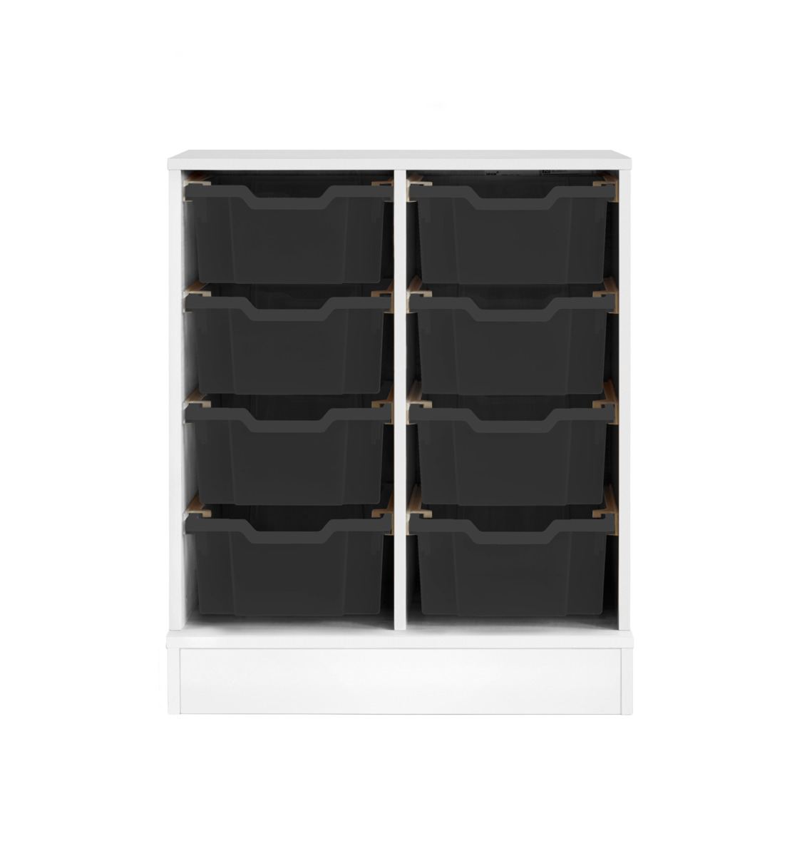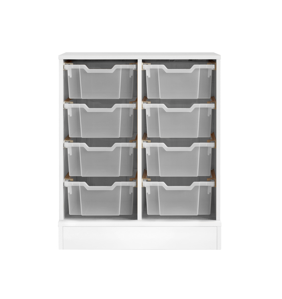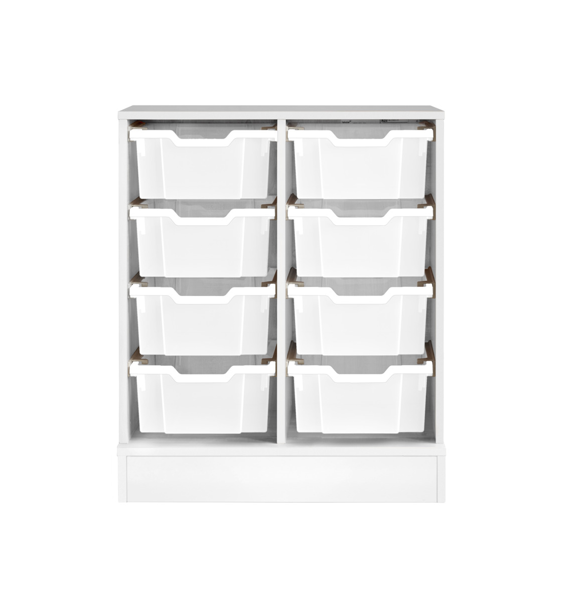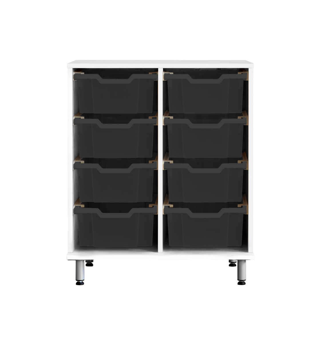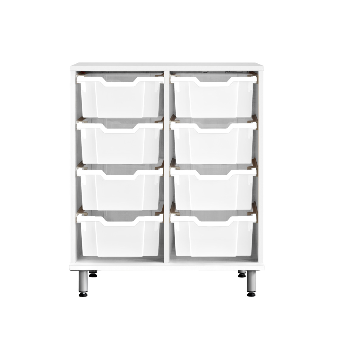 Säilytyskaluste, jossa Gratnellin laatikot. Valittavana pyörät, jalat tai sokkeli. Kuudesta pyörästä kaksi on kiinteitä, mikä tekee säilytyksestä vakaan siirrettäessä. Vapaasti liikkuvat pyörät ovat lukittavia. Materiaali: 18 mm lastulevyä, jossa on laminaattipinta ja ABS-reunanauha. Runko jaloilla ja sokkelilla tulee kiinnittää seinään mukana tulevilla seinäkiinnikkeillä. Ruuvit eivät sisälly toimitukseen. Laatikoiden kiskoissa on pysäyttimet. Laatikon mitat: L31,2 S42,7 K7,5 cm. Laatikon väri valittavissa.