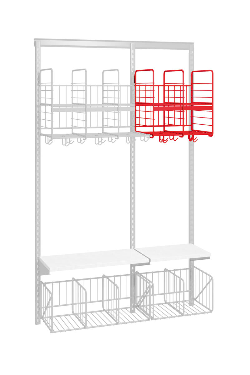 Wille-säilytysjärjestelmään sopiva lokero. Sopii sekä lattia- että seinämalliin. Helppo korkeussäätö. Lokerot rei'itettyä peltiä, 3-osainen hyllytaso lakattua masiivikoivua, S32 cm. Hyllyn vahvuus 2 cm. Vaatii asennuksen. Kiinteät lokerot, L25 S32 cm, lokeron sisäkorkeus 22 cm, ulkokorkeus 25 cm. Koukut voi ostaa erikseen ja kiinnittää hyllytasoon tai käytä Wille koukkulistaa.