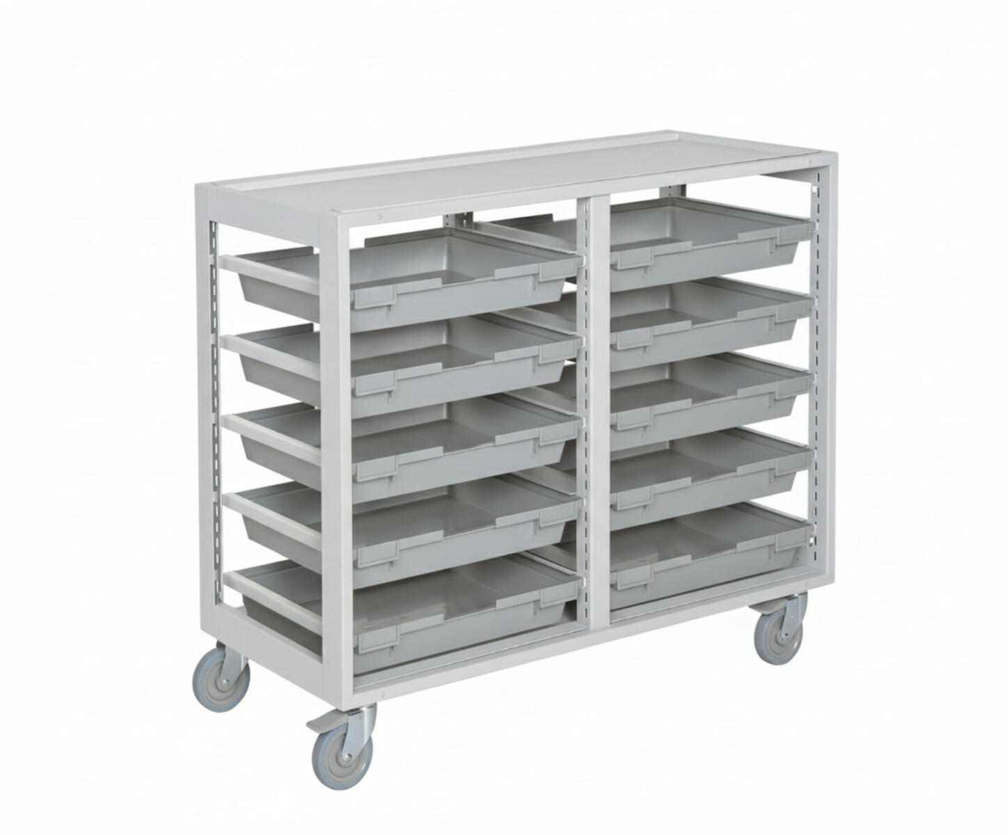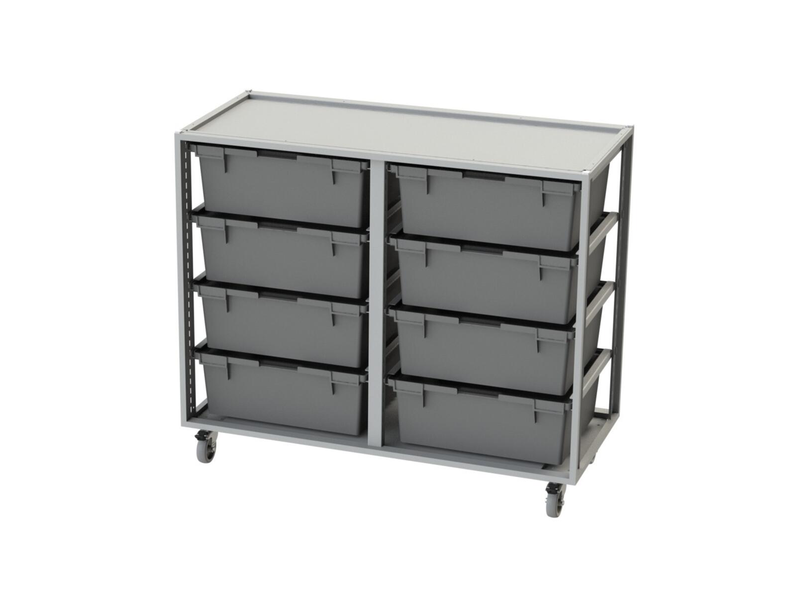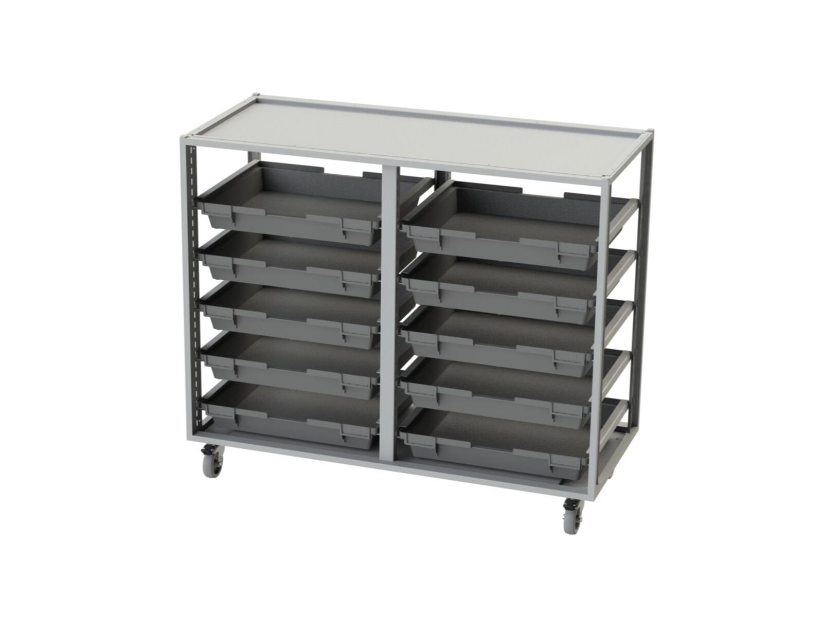 Säilytysvaunu, jossa on tilaa 20 tarjottimelle tai laatikolle. Valitse pelkkä vaunu tai vaunu tarjottimilla. Metallirunko pyörillä, joista kaksi on lukittavia. Pyörät asennettava, lukittavat toiselle lyhyelle sivulle.