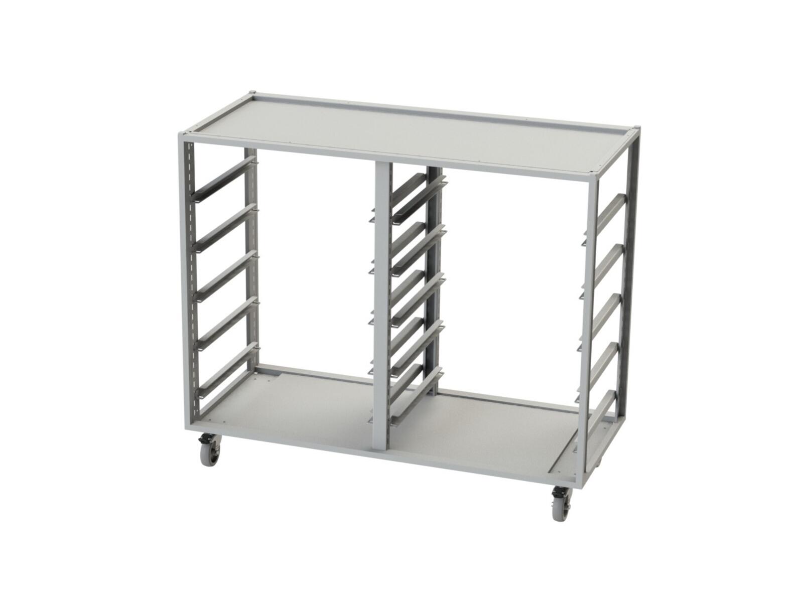 Säilytysvaunu, jossa on tilaa 21 tarjottimelle tai laatikolle. Valitse pelkkä vaunu, vaunu tarjottimilla tai vaunu laatikoilla. Metallirunko pyörillä, joista kaksi on lukittavia. Pyörät asennettava, lukittavat toiselle lyhyelle sivulle.