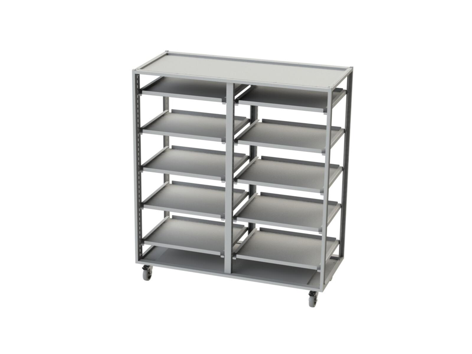 Teräsrunkoinen vaunu virtalähteiden säilytykseen ja siirtoon. Hyllylevyjen reunat estävät virtalähteiden putoamisen siirron aikana. Sisältää 10 kpl teräksisiä hyllylevyjä. Etumaiset pyörät lukittavia. Virtalähteet eivät sisälly.