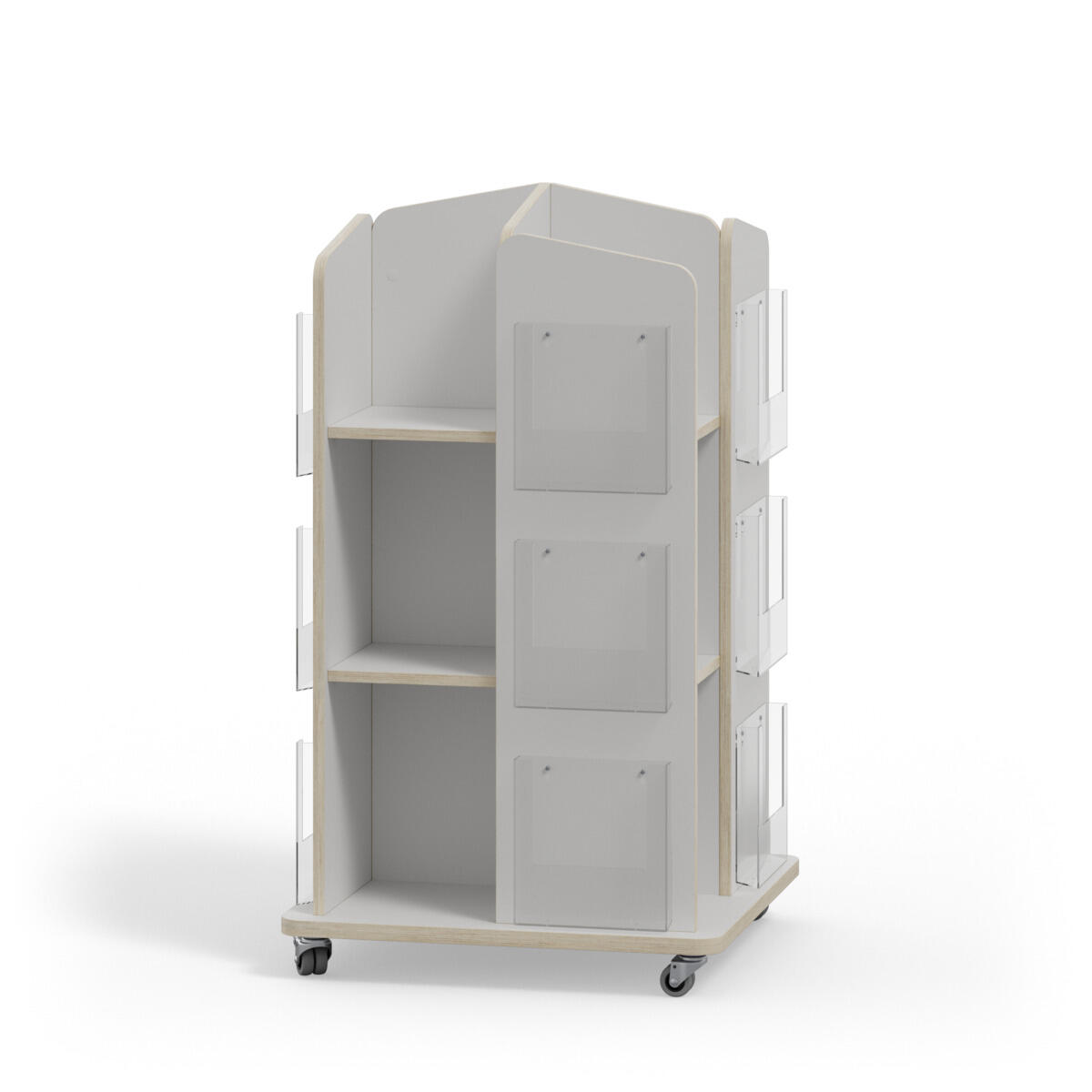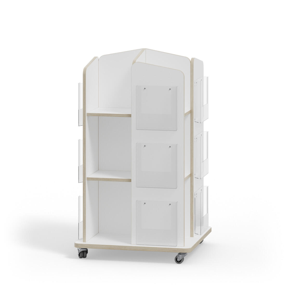 Kirjavaunussa on 4 kaksoispyörää, joista kaksi on lukittavia. Toimituksen yhteydessä koottu. Sivuilla on kolme A4-kokoista muovikoteloa ja kolme hyllytasoa. Kirjavaunu on valmistettu 18 mm lastulevystä, jossa laminaattipinta ja vanerikuvioitu reunanauha. Vaunun kokonaiskorkeus on 120 cm, leveys ja syvyys 60 cm. Pohjalevyn koko on 69x69 cm. Hyllytasojen leveys ja syvyys 27 cm, hyllyjen välinen korkeus on 35 cm. Lattian ja pohjalevyn yläreunan välinen korkeus on 10 cm.