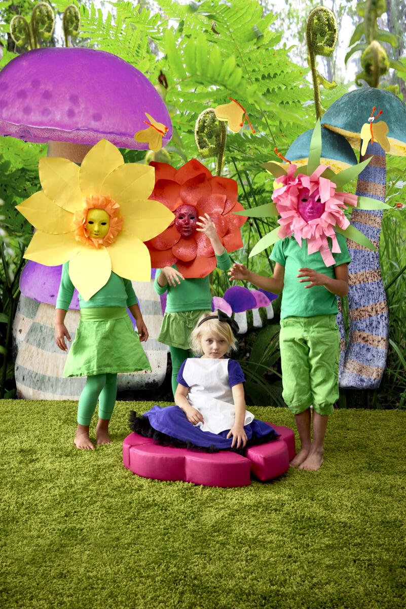 4 kukan terälehdeltä näyttävää toisiinsa kiinnitettävää osaa. Pinottavia, mitat pinottuna: 36x36x60 cm (LxSxK). Yhden tyynyn paksuus on 15 cm. Vaahtomuovi päällystetty helposti puhdistettavalla polyuretaanipinnoitetulla puuvilla/polyesterikankaalla.