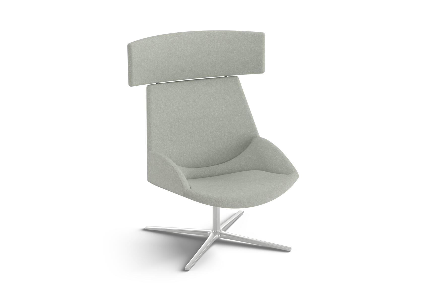 Modernisti muotoiltu ja erittäin mukava pyörivä nojatuoli. Kallistusmekanismi. Ristikkojalka kiillotettua alumiinia. Puurunko ja vaahtomuovipehmuste. Lisämukavuutta varten tarjolla on myös niskatuki lisävarusteena.