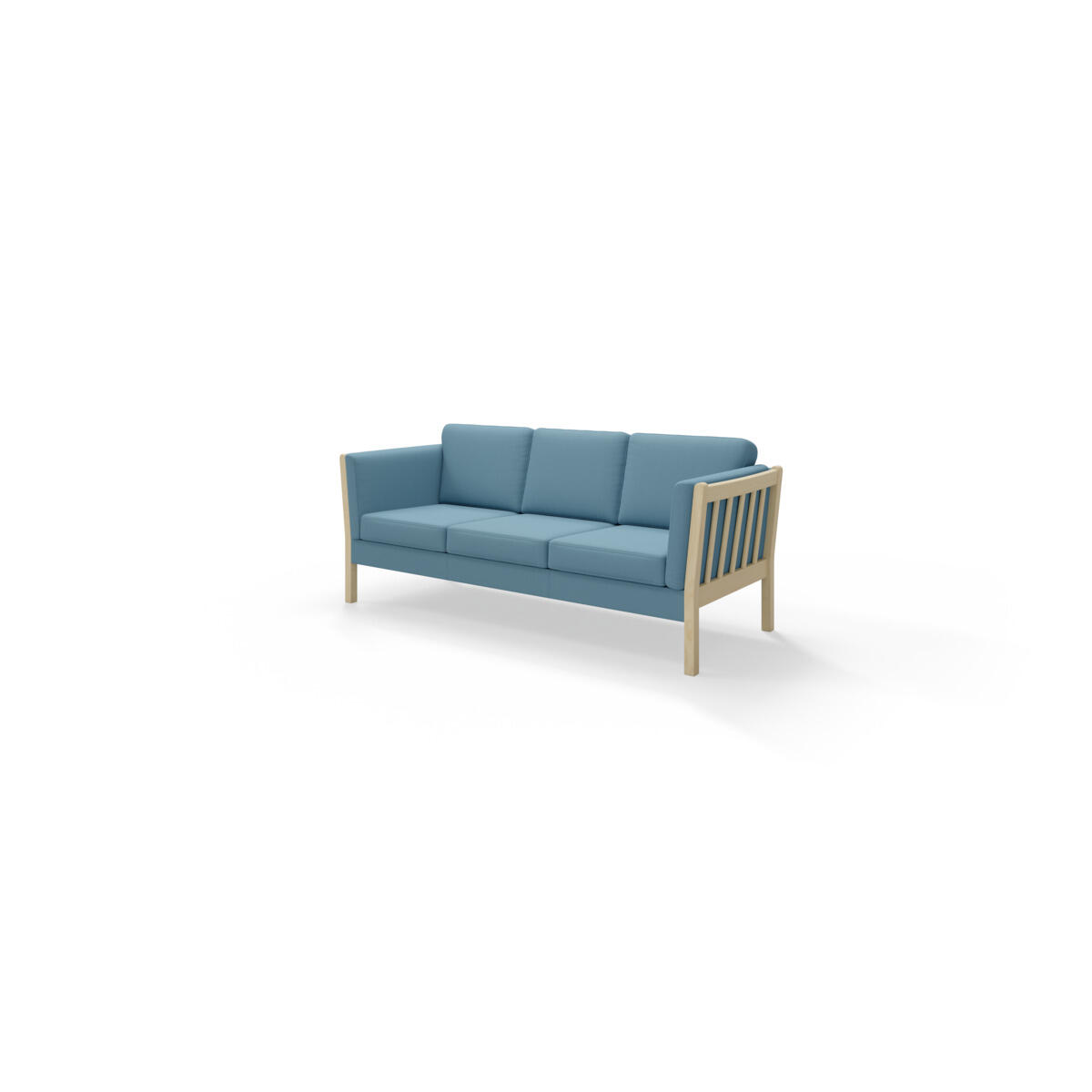 Sohva, jossa on moderni, tyylikäs ja suoralinjainen muotoilu. Selkänojan, istuimen ja käsinojan välinen rako (3 cm) helpottaa puhtaanapitoa. Puurunko ja vaahtomuovipehmuste. Jalat jauhemaalattua metallia.