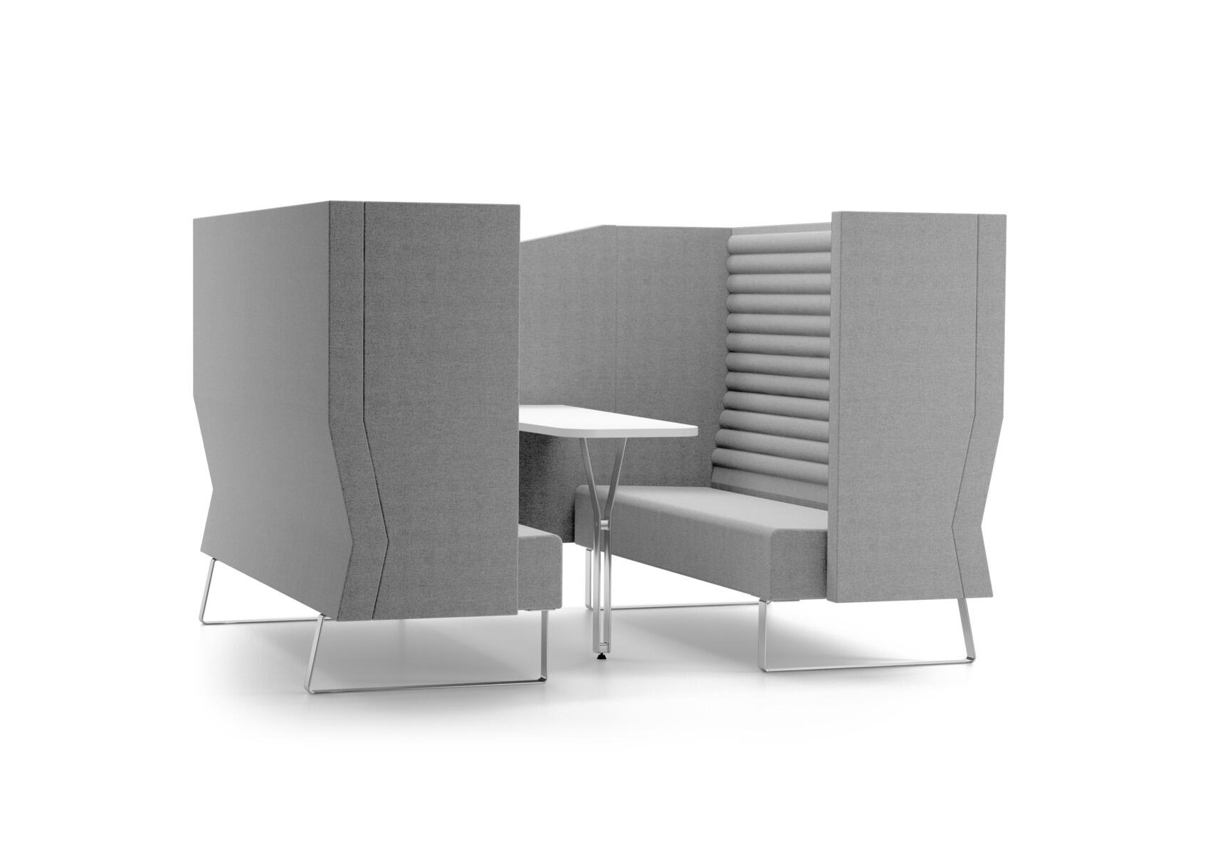 Sohvan korkeat sivut vaimentavat ääntä ja tarjoavat yksityisyyttä, mikä tekee siitä sopivan esimerkiksi ryhmätapaamisiin, yhteistyötehtäviin tai omaan aikaan rauhallisessa ympäristössä. Mukana pöytä, jossa on valkoinen laminaattikansi koossa 120x60/40 cm. Puurunko ja vaahtomuovipehmuste. Jalat jauhemaalattua metallia. Selkänojan ja keskiseinän väri valittavissa. Sivut ja istuin aina harmaana valitussa kankaassa. Lisävarusteena saatavilla pistorasia pöydän kanteen.