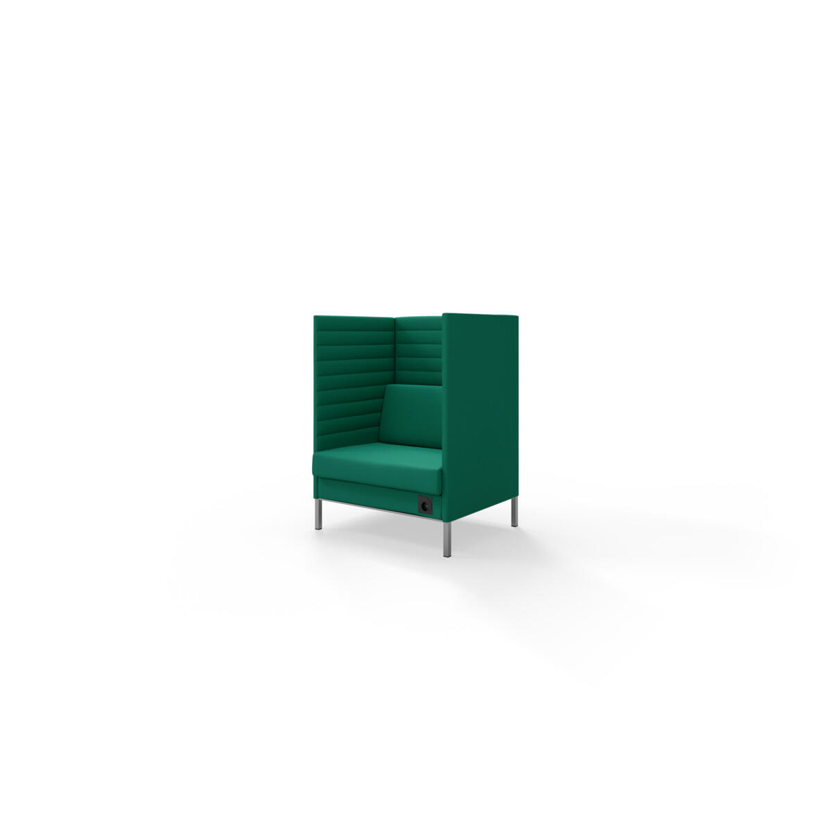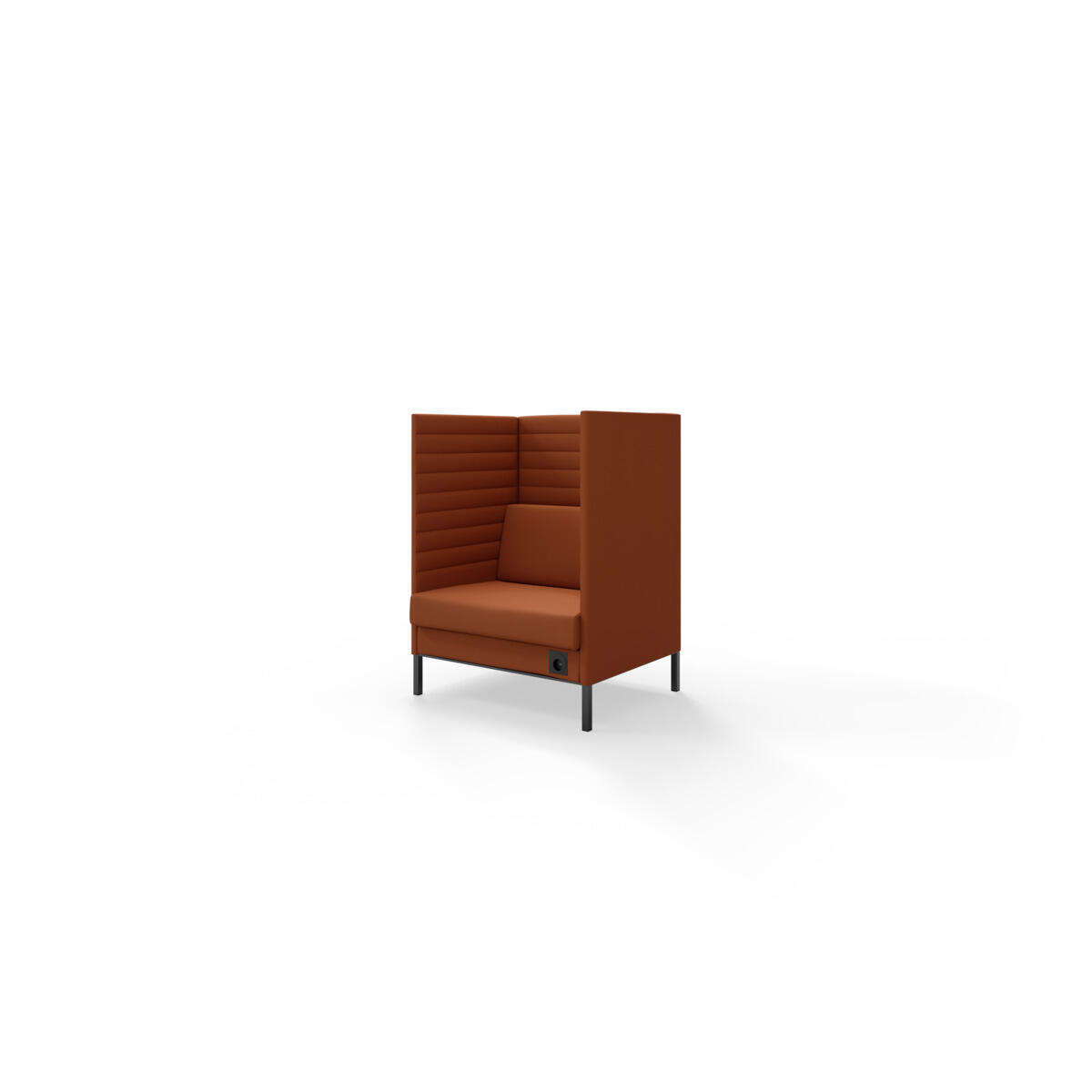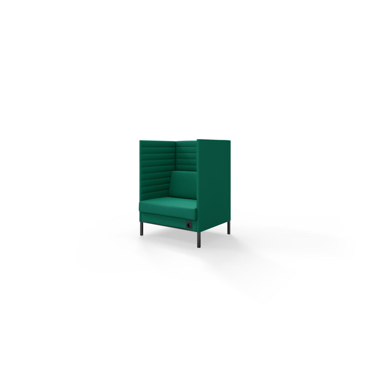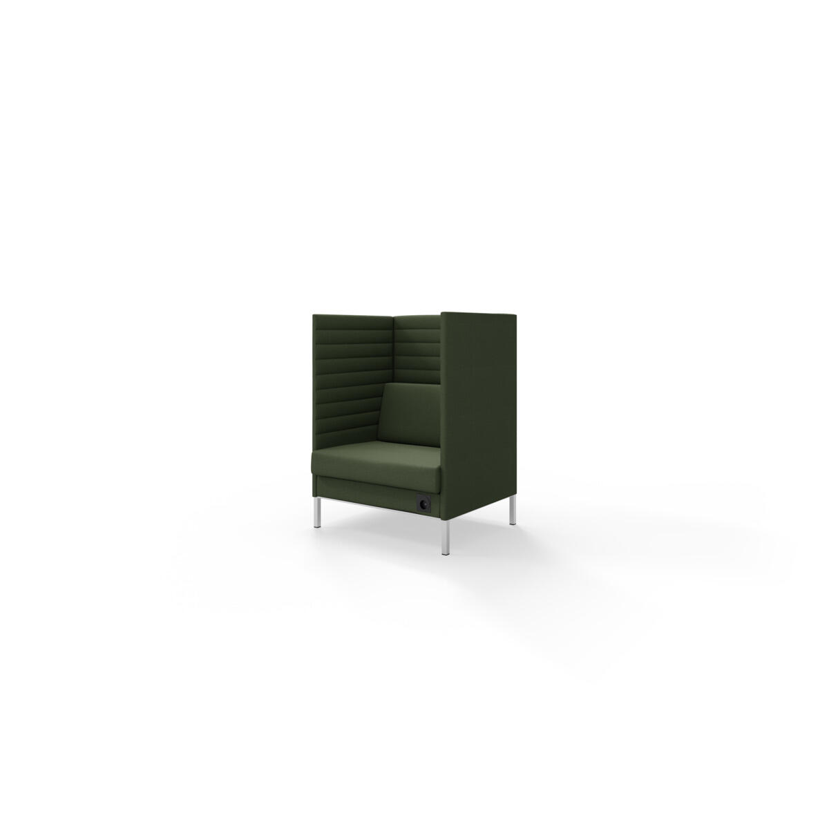 Korkea selkänoja ja korkeat päädyt eristävät ja vaimentavat ääntä tehokkaasti. Puurunko nozag-jousituksella ja vaahtomuovipehmusteella. Jauhemaalattu metallirunko. Sähköpistoke sisältyy. Irrotettava päällinen selkä- ja istuintyynyssä. Korkeiden sivujen ja taustan väri valittavissa. Selkänojatyyny ja istuintyyny aina harmaana valitussa kankaassa.