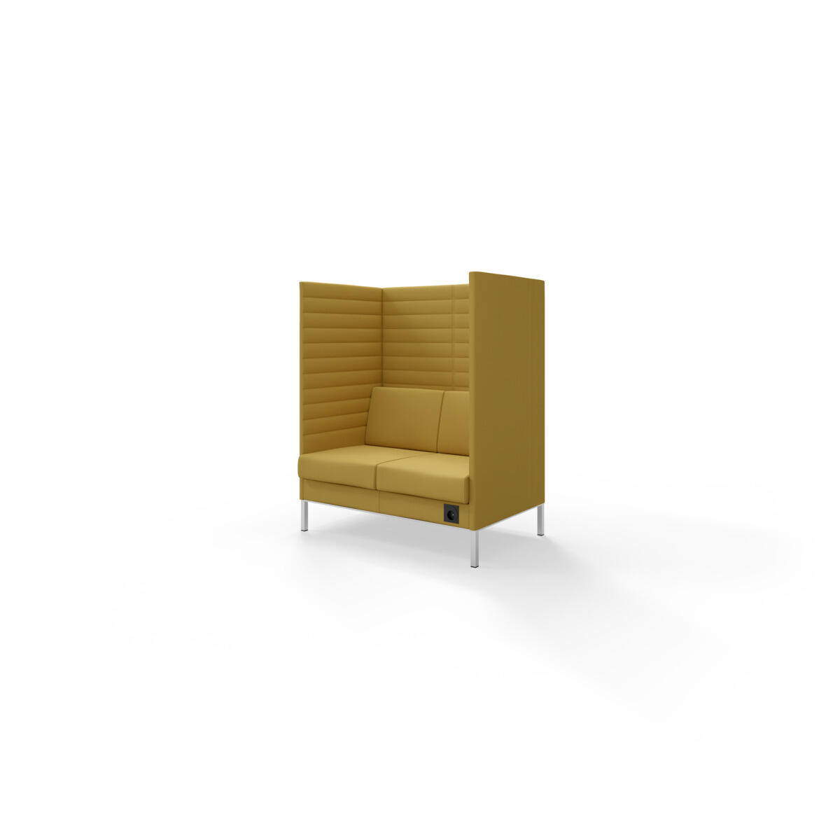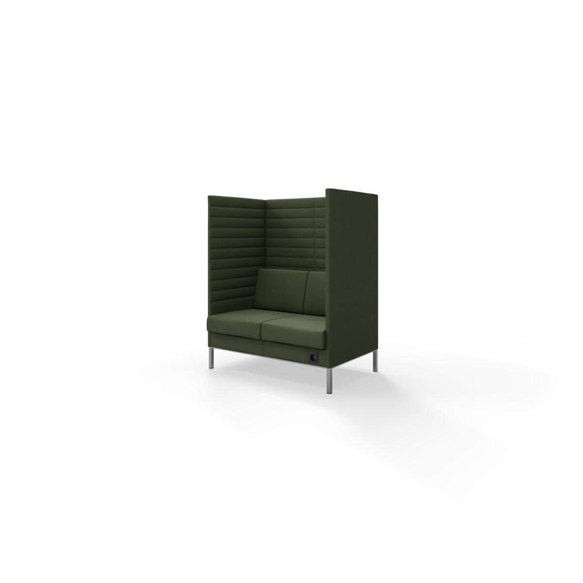 Korkea selkänoja ja korkeat päädyt eristävät ja vaimentavat ääntä tehokkaasti. Puurunko nozag-jousituksella ja vaahtomuovipehmusteella. Jauhemaalattu metallirunko. Irrotettava päällinen selkä- ja istuintyynyssä. Korkeiden sivujen ja taustan väri valittavissa. Selkänojatyyny ja istuintyyny aina harmaana valitussa kankaassa.