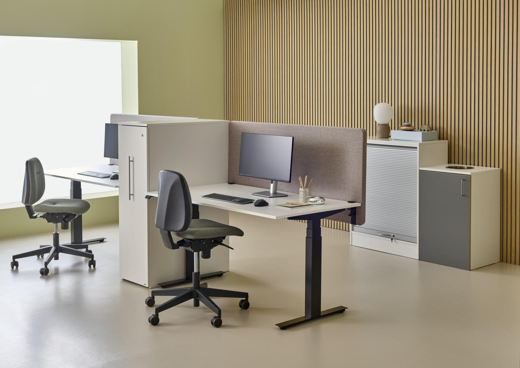 Pöydän kansi laminaattipinnalla ja abs-reunalla. Sähkömoottorilla säädettävä korkeus 63 – 129 cm. Kannen vahvuus 1,8 cm. Pöydässä on törmäyksenestotunnistin, joka pysäyttää korkeudensäädön törmäyksen sattuessa. Jaloissa säätötassut. Jalkasuksen mitat 61+89 x 6 cm.
