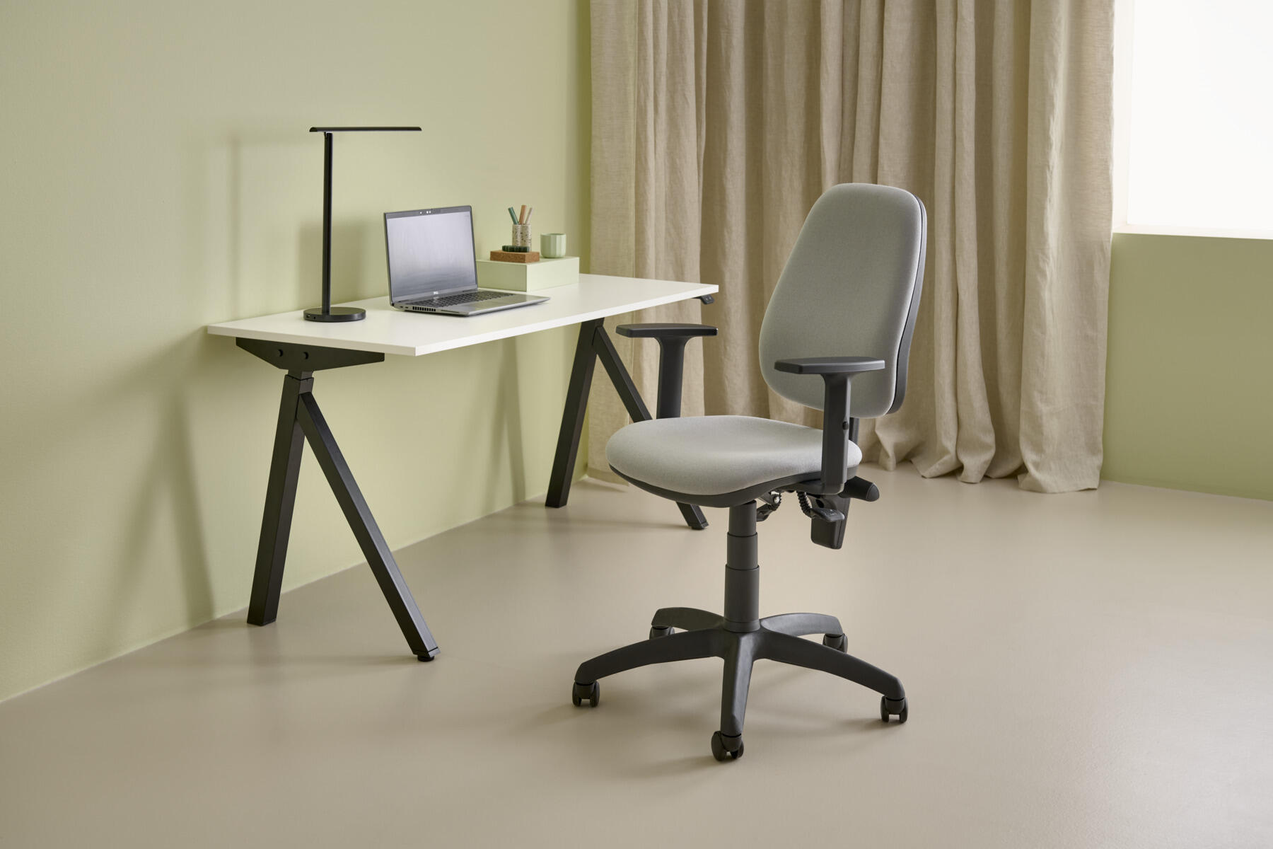 Selkänojan ja istuimenkaltevuuserikseen säädettävissä. Kaasujousellinen korkeussäätö 44-57 cm. Selkänojassa korkeussäätö. Sisältää korkeussäädettävät käsinojat. Kangas 110 000 martindale. Paloturvallisuus: EN 1021 1&2 syttyvyysluokka vaikeasti syttyvä SL1.