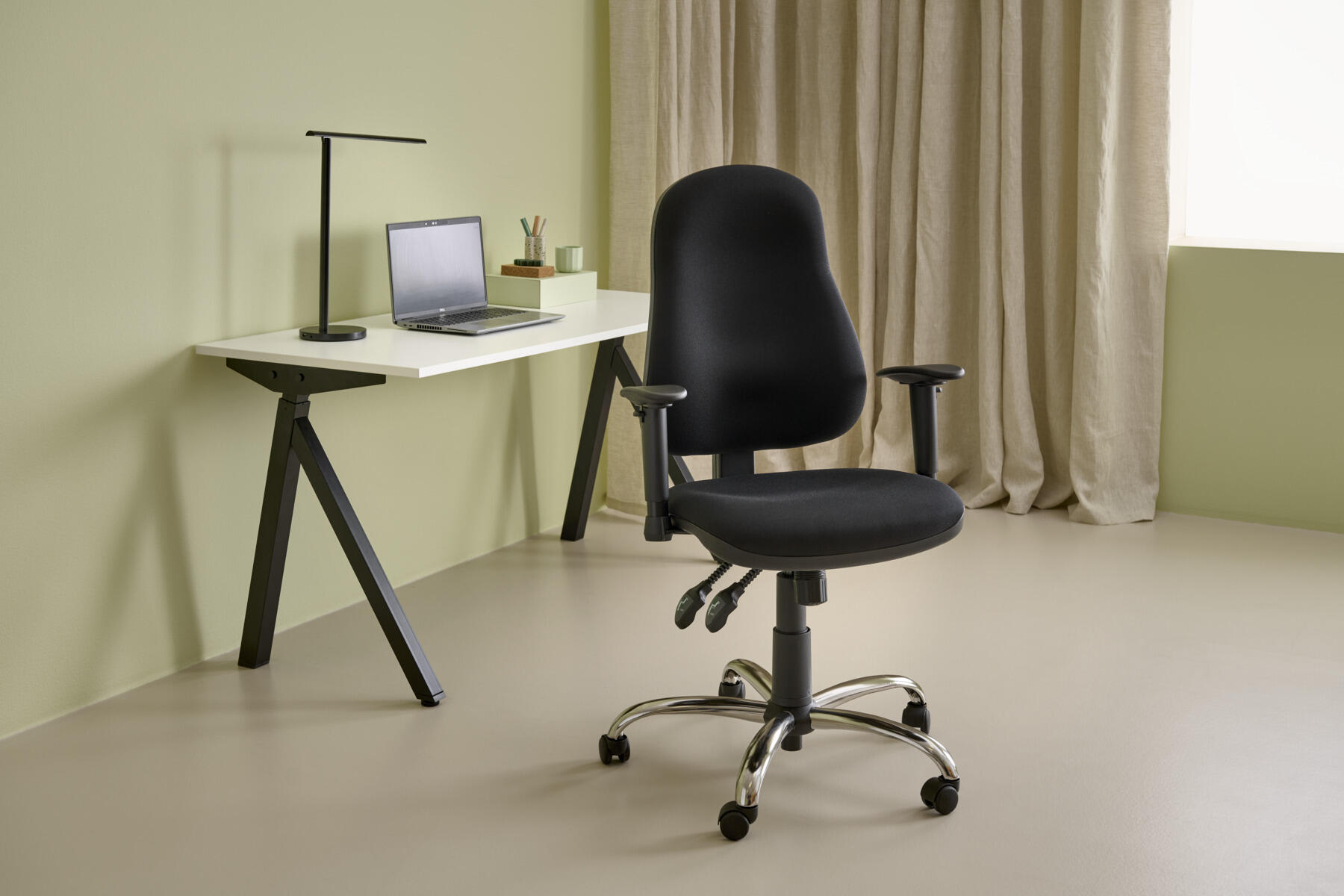 Selkänojan ja istuimenkaltevuuserikseen säädettävissä. Kaasujousellinen korkeussäätö 44-57 cm. Selkänojassa korkeussäätö. Sisältää korkeussäädettävät käsinojat. Kangas 110 000 martindale. Paloturvallisuus: EN 1021 1&2 syttyvyysluokka vaikeasti syttyvä SL1.