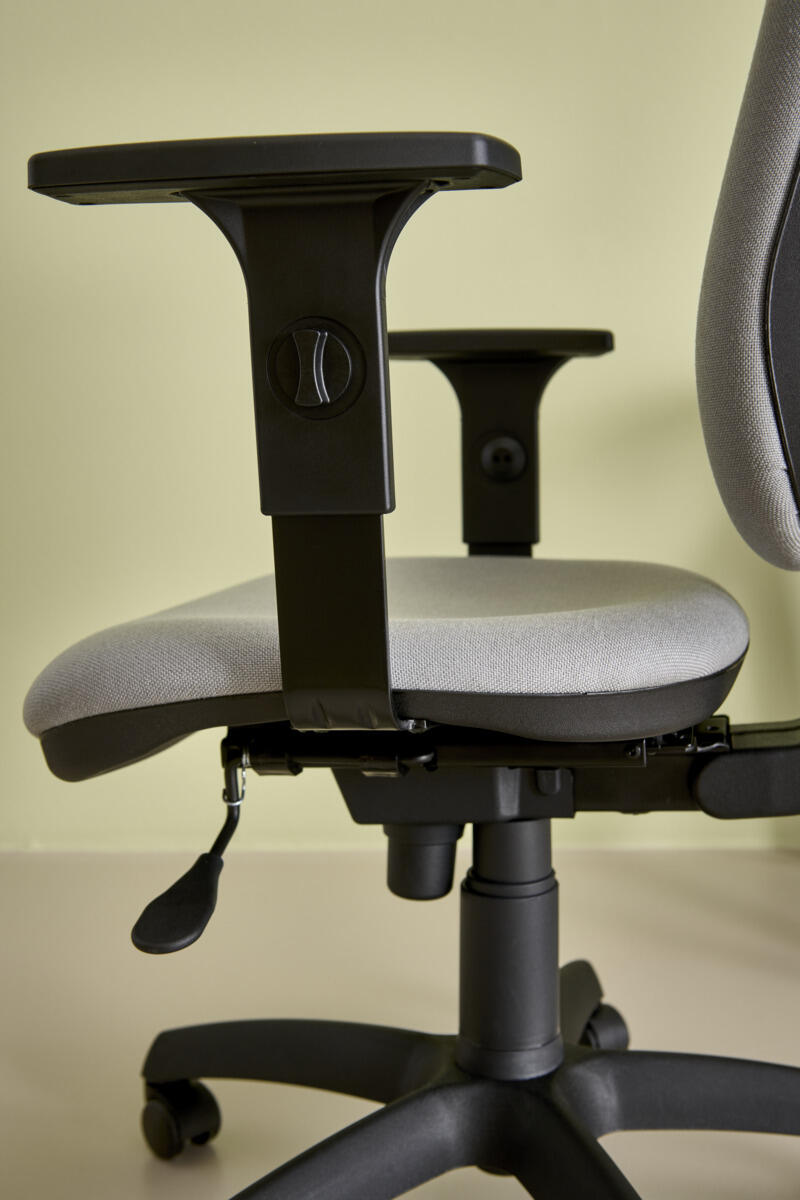 Selkänojan ja istuimenkaltevuuserikseen säädettävissä. Kaasujousellinen korkeussäätö 44-57 cm. Selkänojassa korkeussäätö. Sisältää korkeussäädettävät käsinojat. Kangas 110 000 martindale. Paloturvallisuus: EN 1021 1&2 syttyvyysluokka vaikeasti syttyvä SL1.