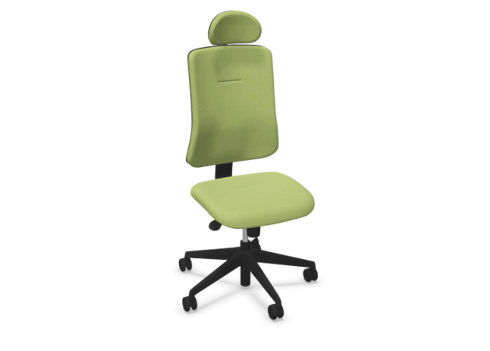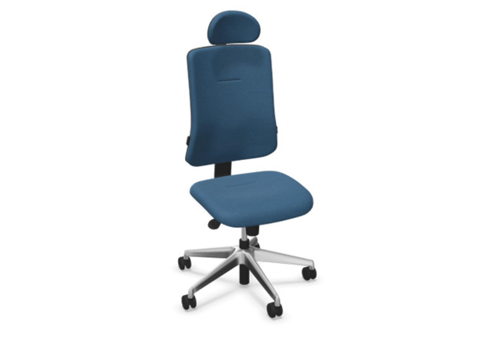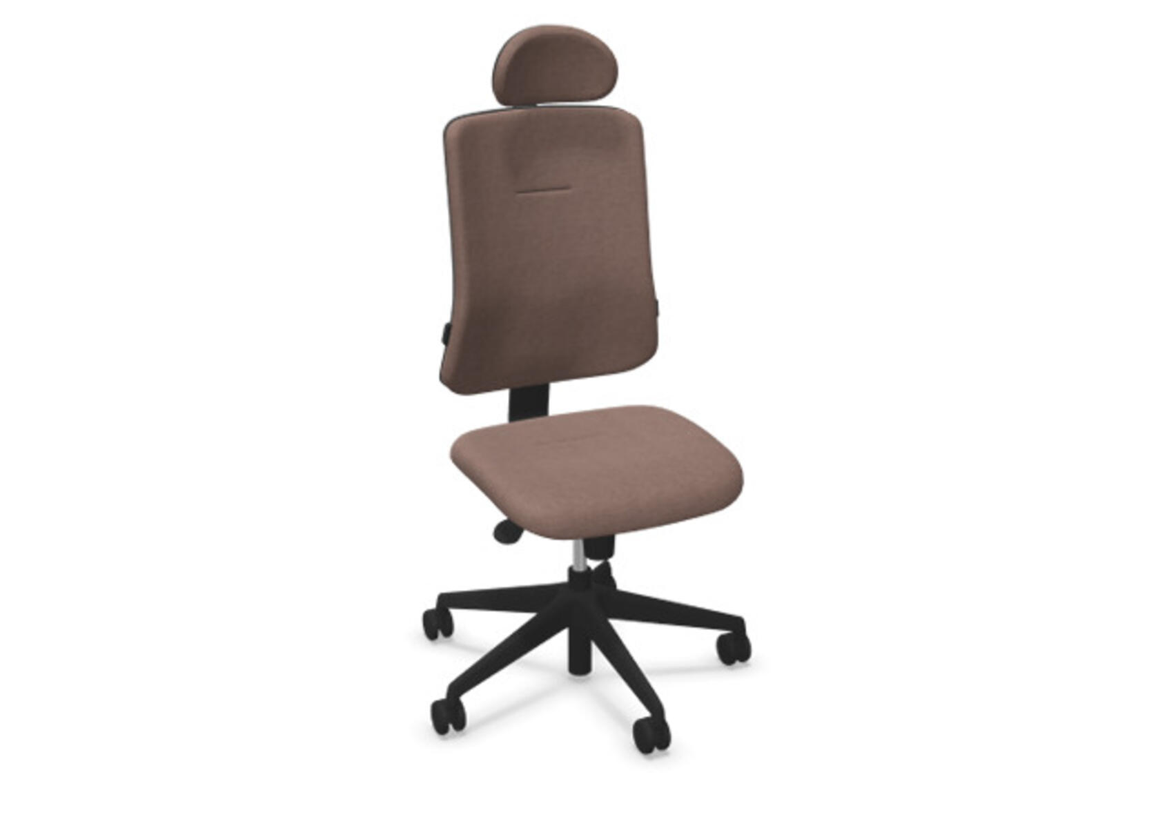 Ergonominen toimistotuoli, jossa verhoiltu selkänoja. Edistynyt synkronimekanismi takaa aktiivisen ja mukavan istuma-asennon koko työpäivän ajan. Verhoiltu polyesterikankaalla. Synkronoitu selkänojan ja istuimen kallistus mahdollistaa aktiivisen ja mukavan istuma-asennon. Selkänojan kallistuskulma 20° synkronoitu istuimen 11° kallistuskulman kanssa. Selkänoja lukittavissa 5 asentoon, selkänojan vastus säädettävissä säätönupilla. Selkänoja on korkeussäädettävä 70 mm ja lukittavissa 5 eri asentoon. Verhoiltu niskatuki, säädettävä: syvyys 20 mm, kulma 70° ja korkeus 100 mm. Selkänojassa on Anti-Shock-toiminto, joka estää selkänojaa palautumasta äkillisesti, kun kallistus vapautetaan. Valitse ristikko mustasta polyamidista tai kiillotetusta alumiinista sekä itsestään jarruttavat pyörät pehmeille tai koville lattioille. Lisävarusteena saatavilla lannerangan tuki, manuaalisesti säädettävä syvyyssuunnassa (15 mm) ja korkeussuunnassa (20 mm). Käsinojat (2D, 3D tai 4D) myydään erikseen.