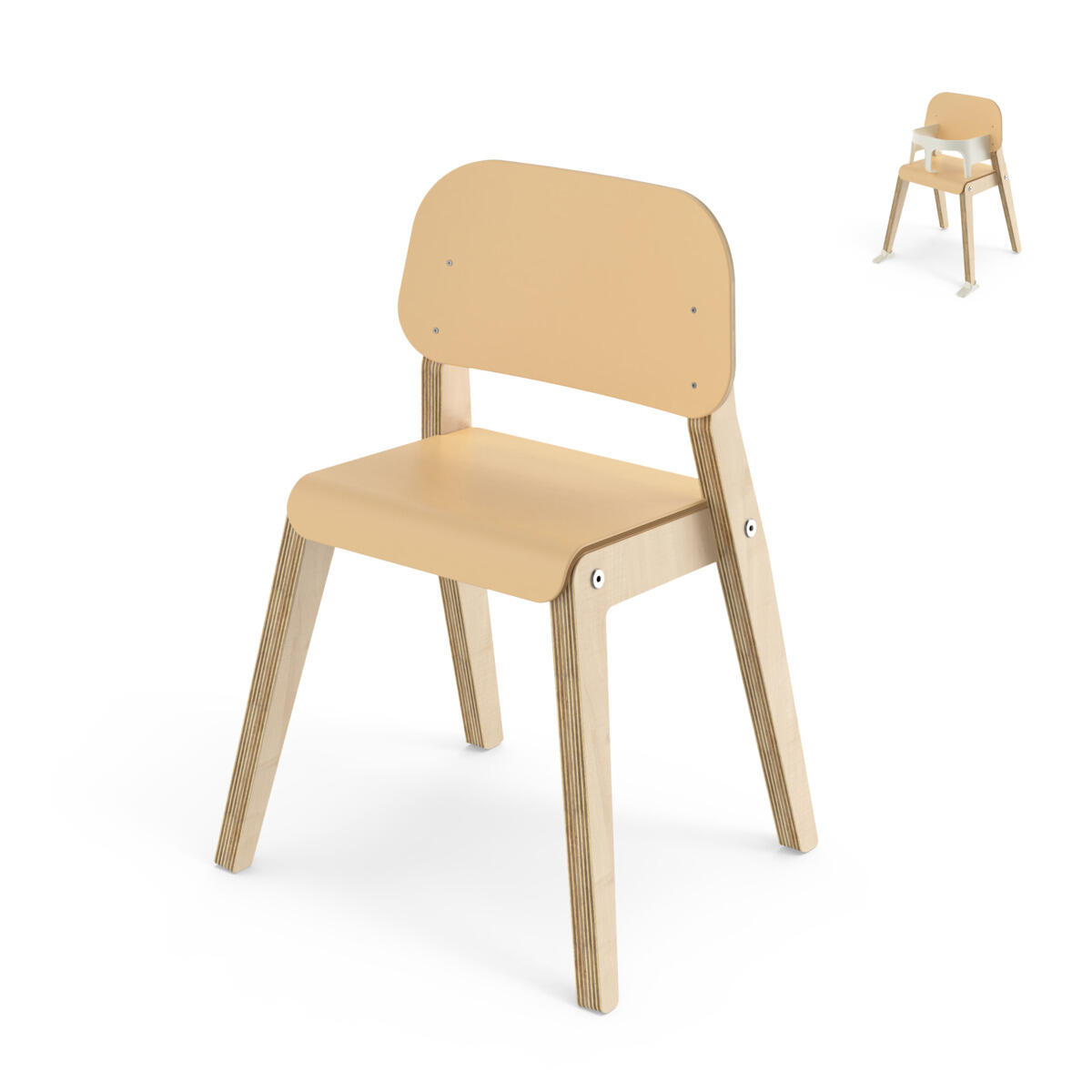 Käsinojallisen selkänojan kaareva muoto antaa lapselle lisämukavuutta ja tukea. Tuoli ripustuu pöytään käsinojistaan. Hieman taaksepäin kallistuva istuin estää lapsen liukumisen tuolilta, ja kaareva etureuna tuntuu miellyttävältä, eikä paina lapsen jalkoja. Tuolissa ei ole uria eikä koloja, mikä tekee siitä helpon pyyhkiä ja pitää puhtaana. Tuolin istuinsyvyys ja -korkeus on suunniteltu 105–125 cm pituisille lapsille. Vanerinen jalkatuki on säädettävissä viiteen korkeuteen, 15-35 cm, 5 cm välein. Tuoli voidaan pinota, max 3/pino. Tuoli täyttää lasten tuolien standardin EN 17191 tiukat vaatimukset, mikä takaa lapsille parhaan mahdollisen turvallisuuden ja mukavuuden.