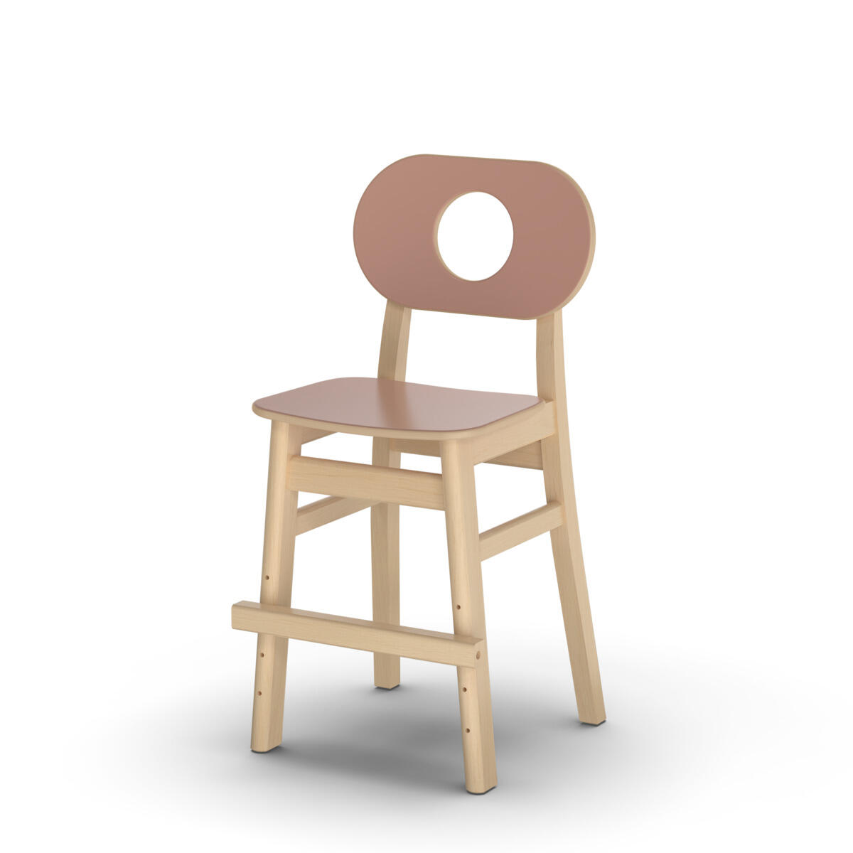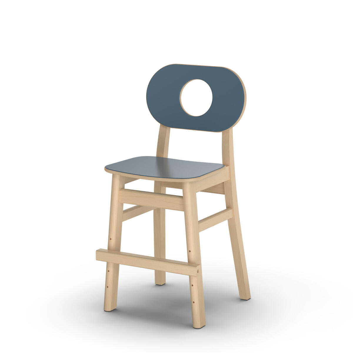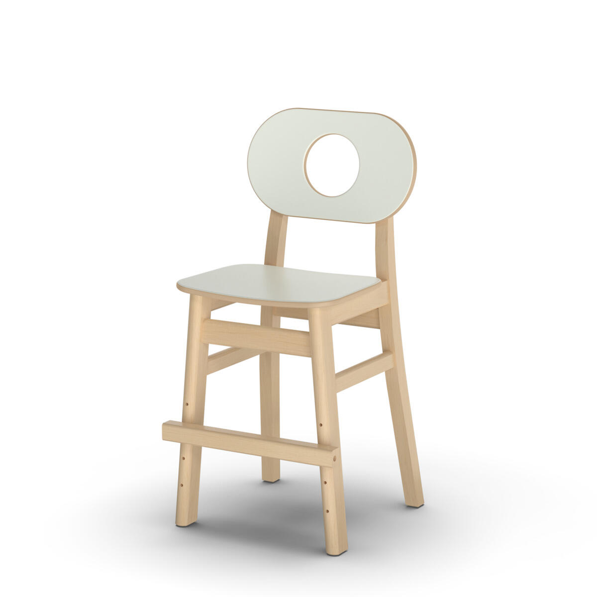 Tuolin runko on kirkaslakattua massiivikoivua. Istuimessa ja selkänojassa on pyöristetyt reunat ja kulutusta kestävä korkeapainelaminaattipinta. Jalkatuki säädettävissä 3 korkeuteen.