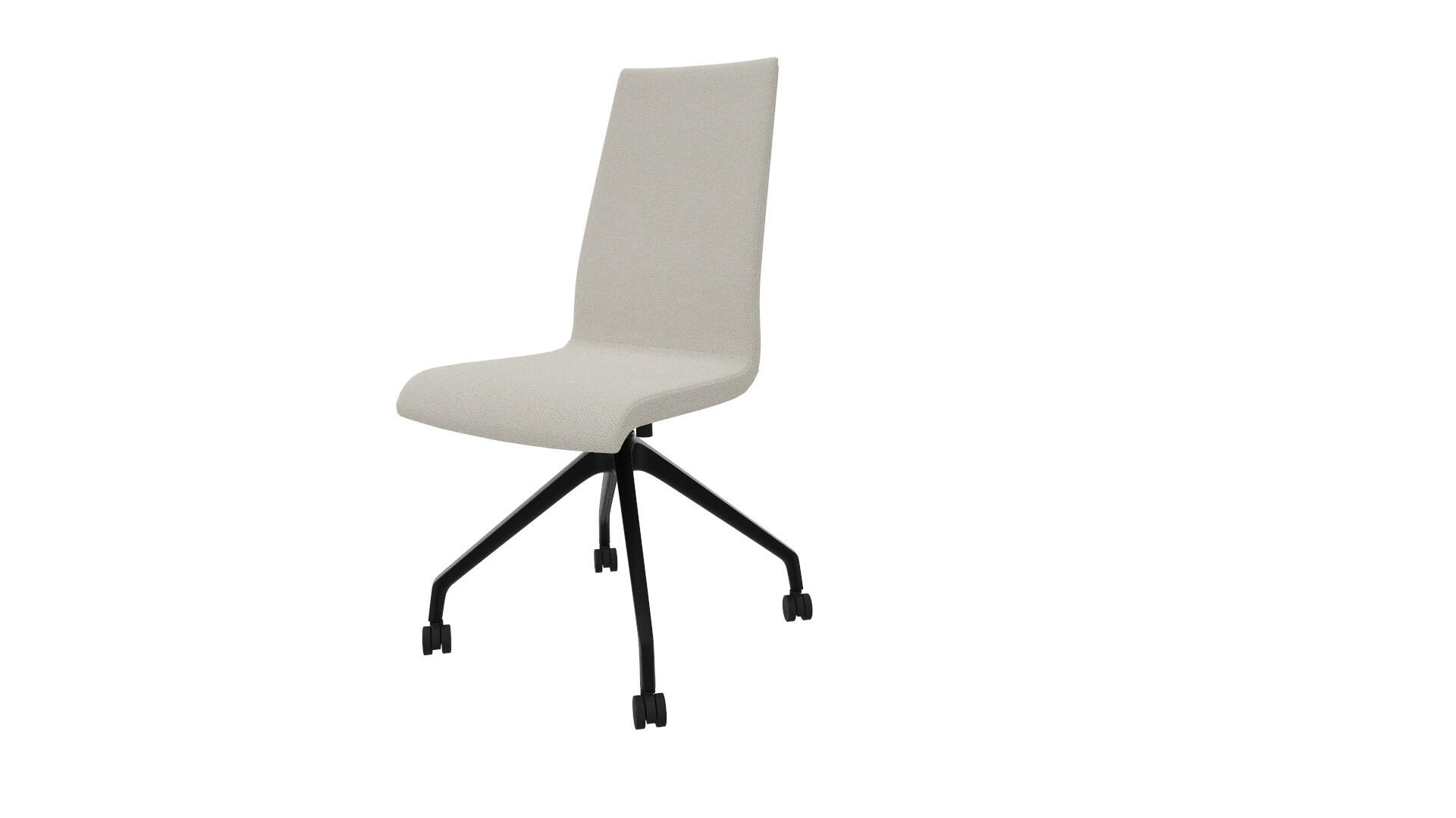 Tyylikäs ja toiminnallinen neuvottelutuoli kokoushuoneisiin ja toimistoympäristöihin. Sileä, korkea selkänoja. Muotoon puristetusta vanerista valmistettu istuinosa, joka on pehmustettu vaahtomuovilla, tarjoten sekä mukavuutta että tukea. Musta nylonristikko kovilla pyörillä, jotka toimivat myös pehmeillä lattioilla.