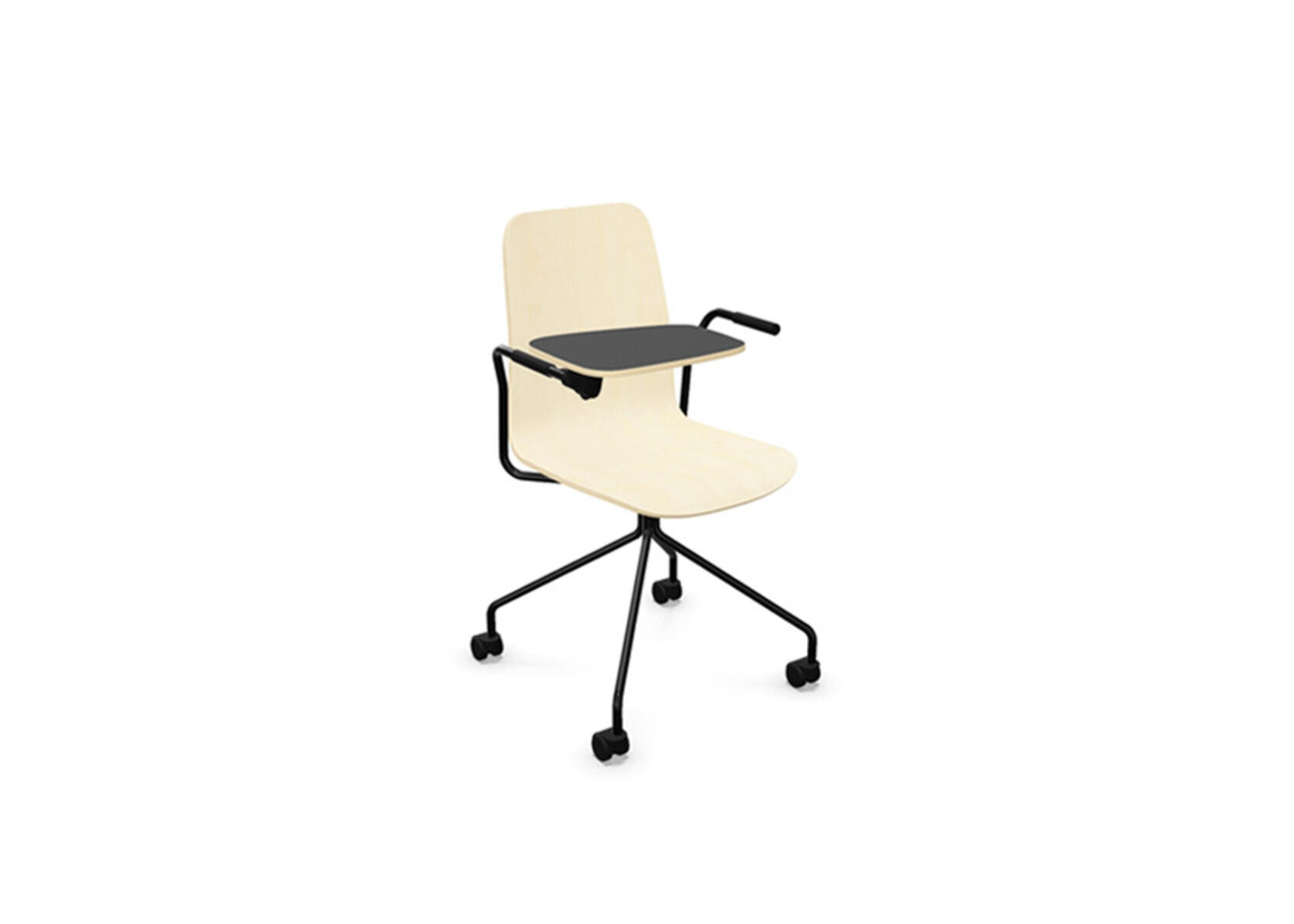 Ympäriverhoiltu, vaahtomuovilla pehmustettu istuinosa on valmistettu muotoonpuristetusta vanerista. Vakaa, jauhemaalattu jalusta ø 18 mm teräsputkesta. Korkea 4-sakarainen ristikko kovalle lattialle sopivilla pyörillä. Valittavana käsinojat. Vapaasti pyörivä, ei korkeussäädettävä.