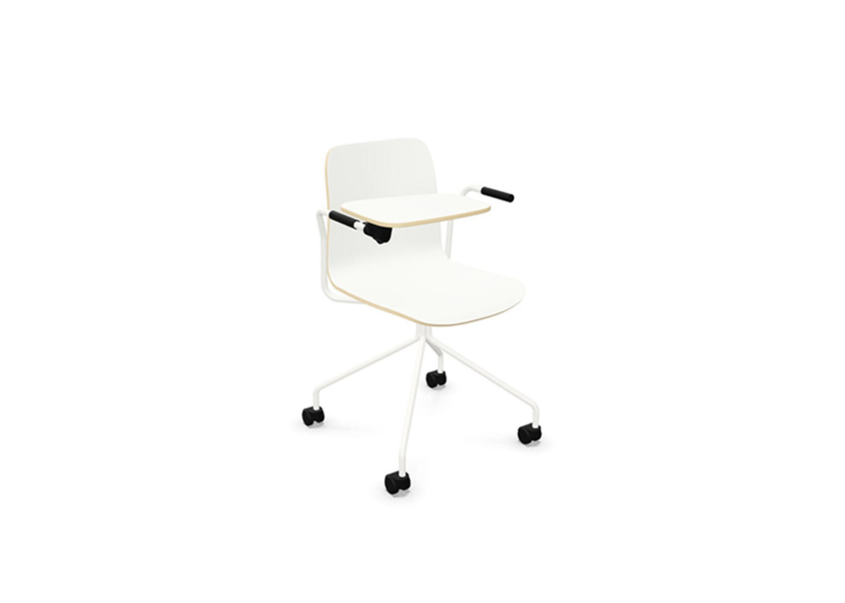 Vapaa tuoli, matala selkä, kirjoitustaso, valkoinen ristikko pyörillä