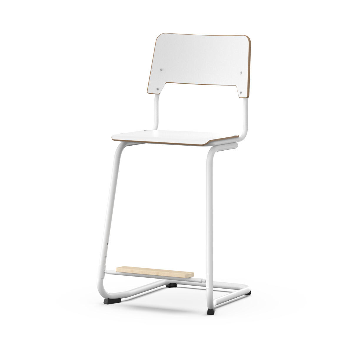 Istuin ja selkänoja on valmistettu vanerista, pinnassa korkeapainelaminaattia. Muotoiltu istuin lisää istuinmukavuutta. Tuoli on hyväksytty EN 1729-1 & 2 standardin mukaan. Runko valkoinen RAL 9003. Jaloissa on huopatassut. Tuoli pinoutuu ja on ripustettavissa pöytään selkänojasta. Selkänojan alapinnassa on naarmuttamista estävät pehmikkeet. Selkänojan takana oleva rungon yläpää toimii laukkukoukkuna. Jalkatuki säädettävissä kolmeen korkeuteen, 26, 31 ja 36 cm istuimesta.