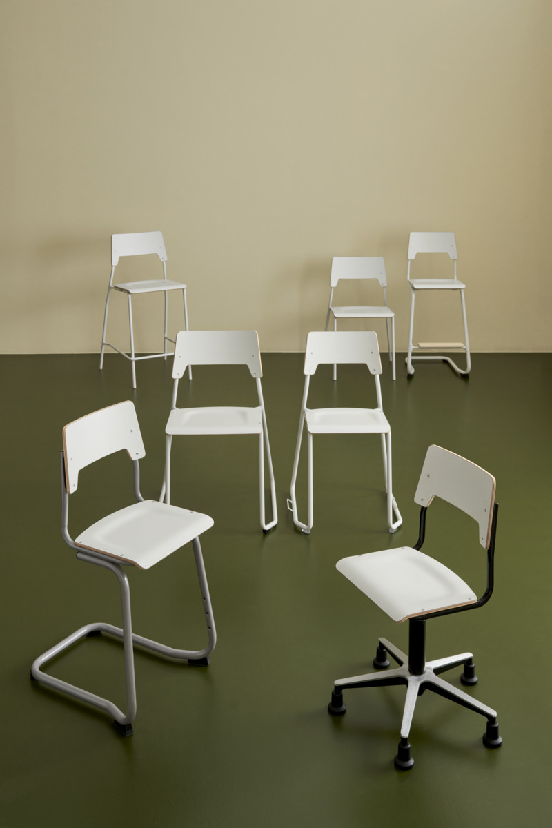 Istuin ja selkänoja on valmistettu vanerista, pinnassa korkeapainelaminaattia. Muotoiltu istuin lisää istuinmukavuutta. Korkeutta säädetään kaasujousella helposti yhdestä vivusta. Tuoli on ripustettavissa pöytään selkänojasta. Selkänojan alapinnassa on naarmuttamista estävät pehmikkeet. Selkänojan takana oleva rungon yläpää toimii laukkukoukkuna. Tuolissa on kestävä muoviristikko ja liukutassut.