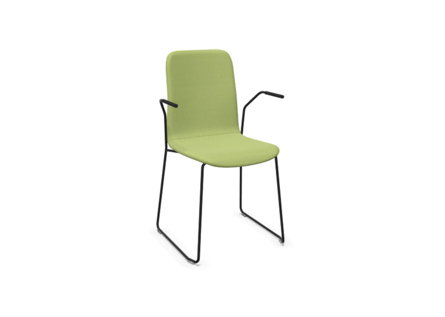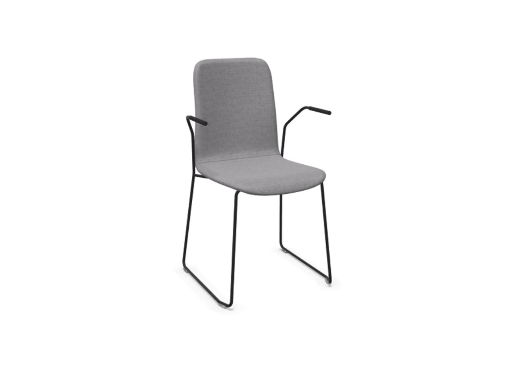 Ympäriverhoiltu, vaahtomuovilla pehmustettu istuinosa on valmistettu muotoonpuristetusta vanerista. Vakaa, jauhemaalattu jalusta ø 12 mm teräsputkesta, varustettu kalustetassuilla lattian suojaamiseksi. Valittavana käsinojat. Enimmäiskuormitus 110 kg. Tuoli on pinottavissa enintään 6 kpl pinoon