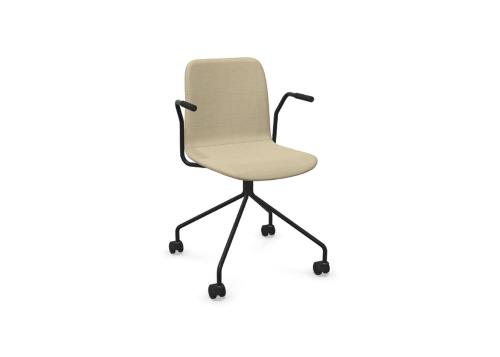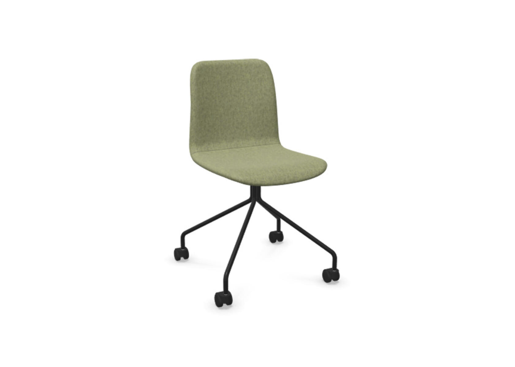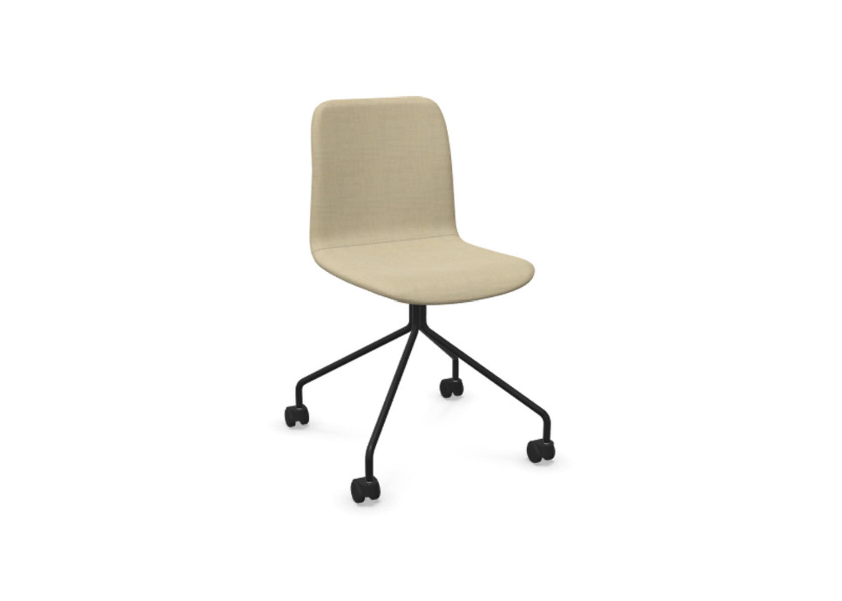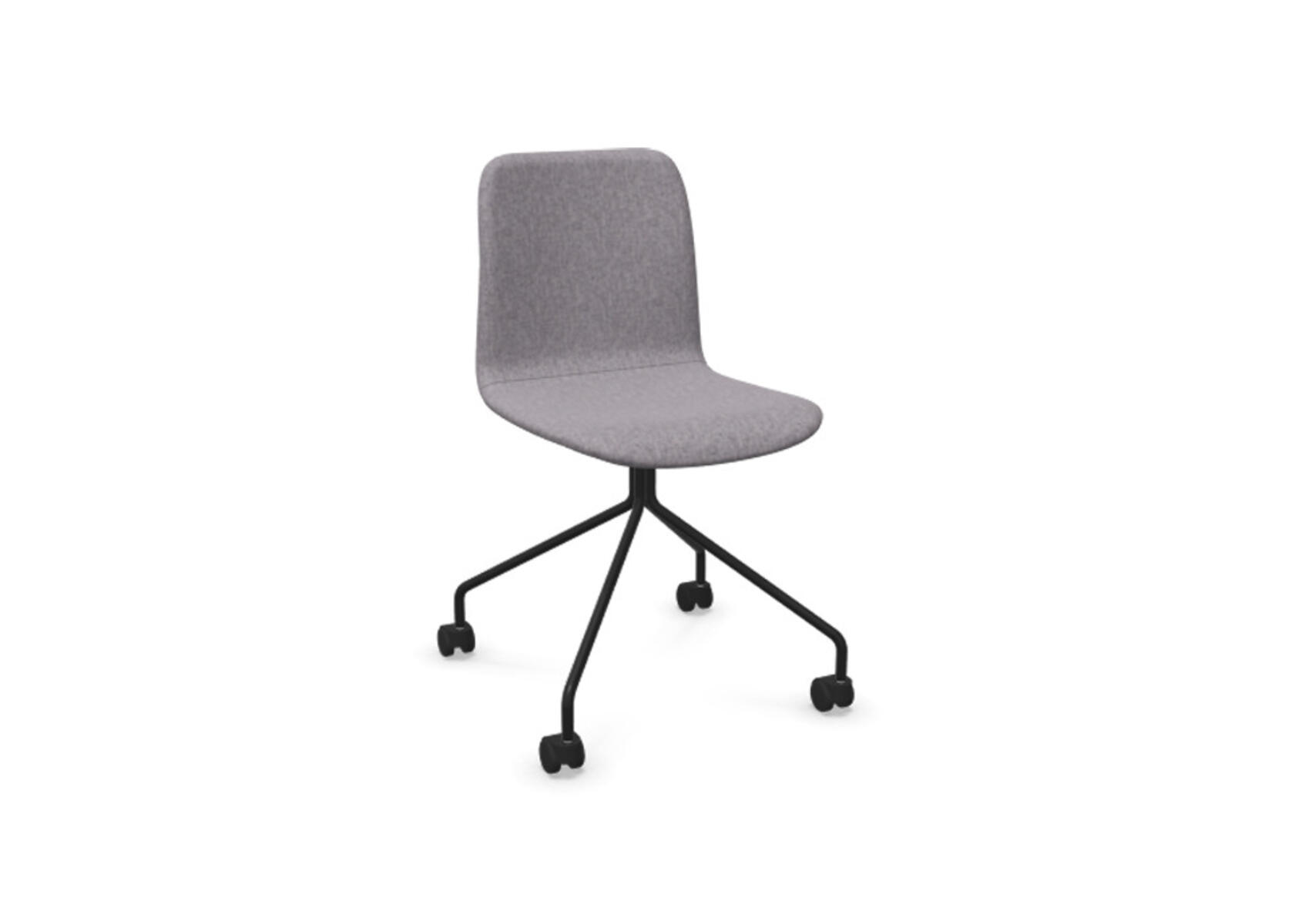 Ympäriverhoiltu, vaahtomuovilla pehmustettu istuinosa on valmistettu muotoonpuristetusta vanerista. Vakaa, jauhemaalattu jalusta ø 18 mm teräsputkesta. Korkea 4-sakarainen ristikko kovalle lattialle sopivilla pyörillä. Valittavana käsinojat. Vapaasti pyörivä, ei korkeussäädettävä.