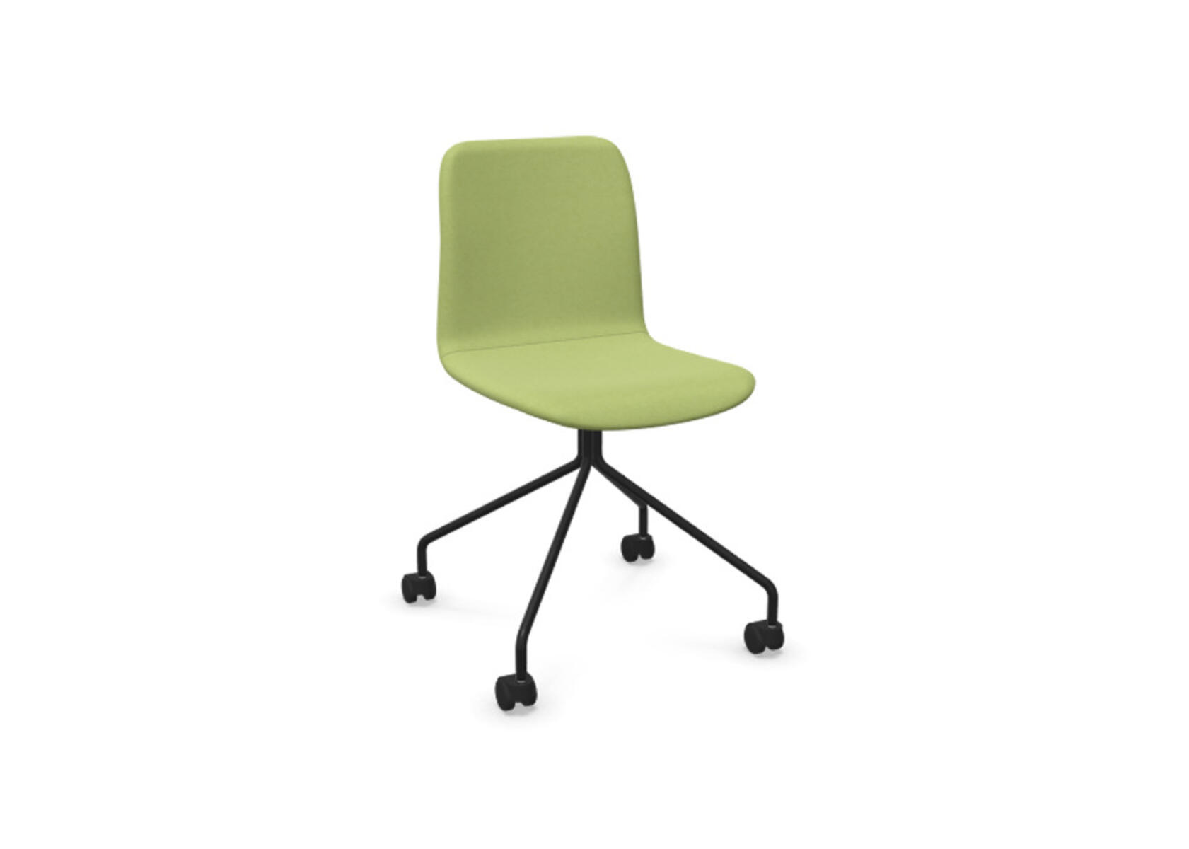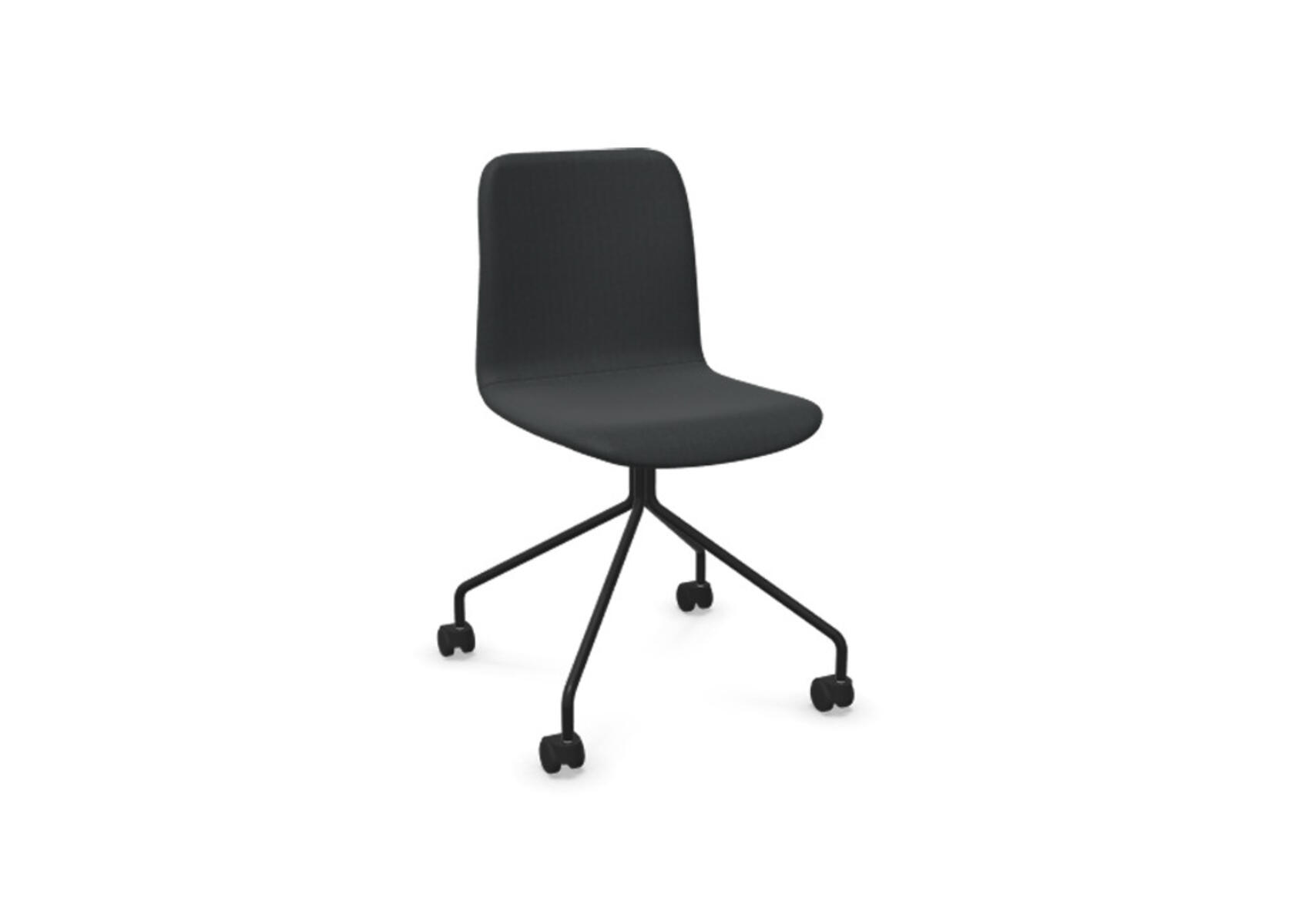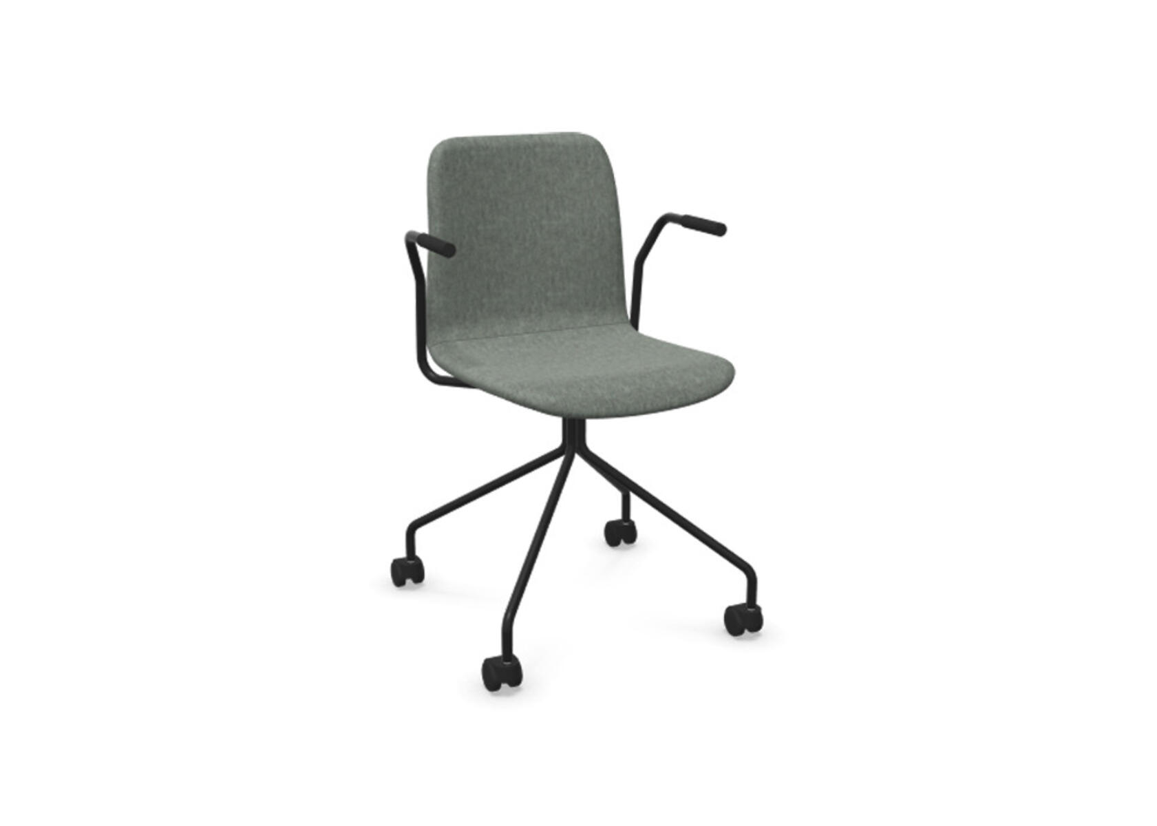 Ympäriverhoiltu, vaahtomuovilla pehmustettu istuinosa on valmistettu muotoonpuristetusta vanerista. Vakaa, jauhemaalattu jalusta ø 18 mm teräsputkesta. Korkea 4-sakarainen ristikko kovalle lattialle sopivilla pyörillä. Valittavana käsinojat. Vapaasti pyörivä, ei korkeussäädettävä.