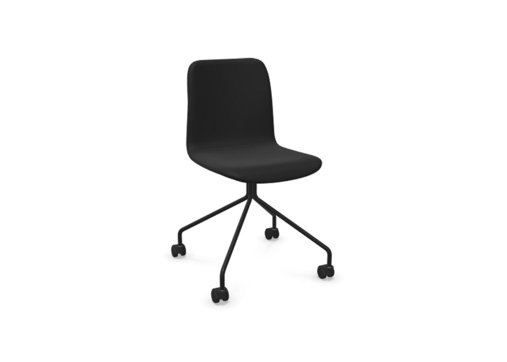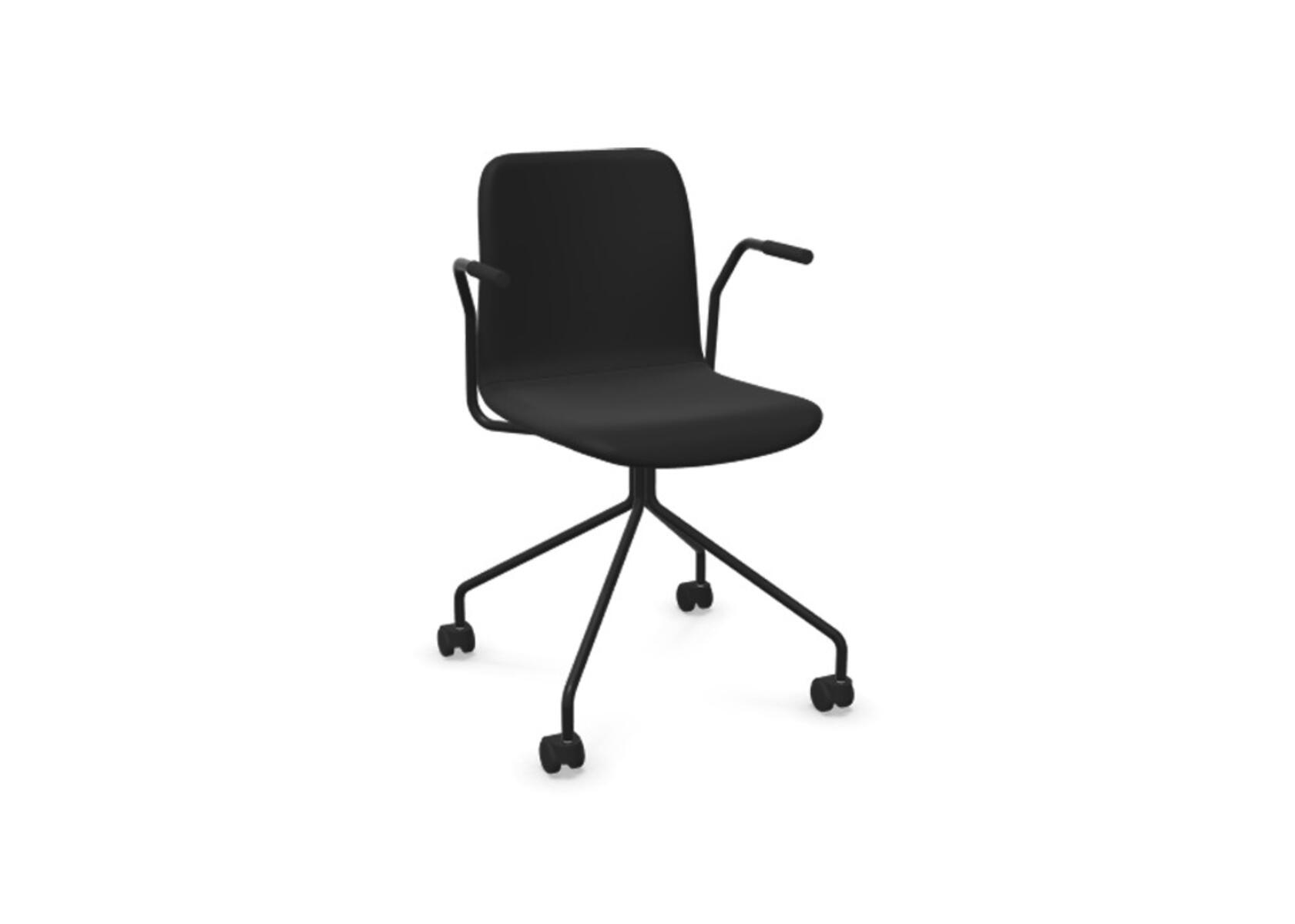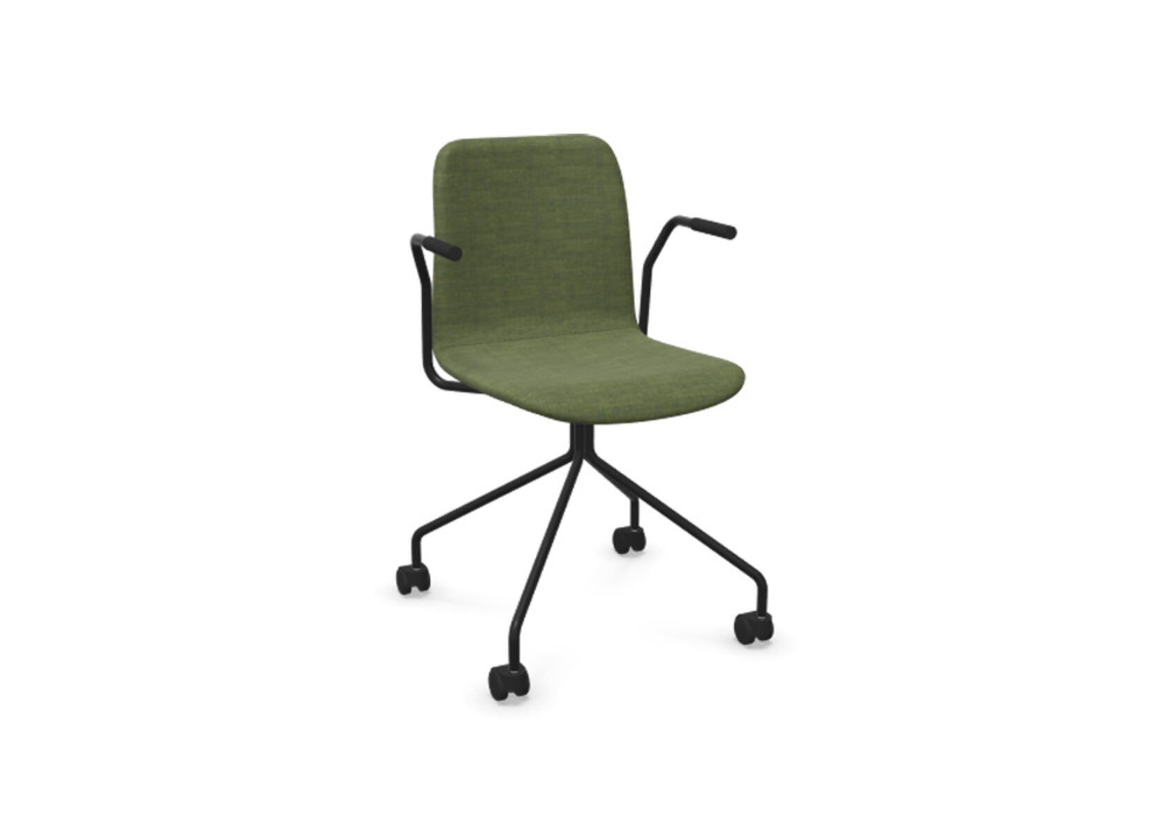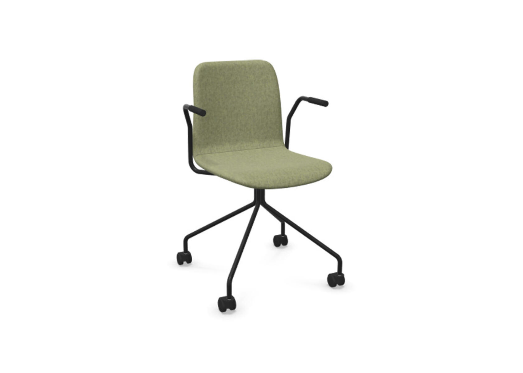 Ympäriverhoiltu, vaahtomuovilla pehmustettu istuinosa on valmistettu muotoonpuristetusta vanerista. Vakaa, jauhemaalattu jalusta ø 18 mm teräsputkesta. Korkea 4-sakarainen ristikko kovalle lattialle sopivilla pyörillä. Valittavana käsinojat. Vapaasti pyörivä, ei korkeussäädettävä.