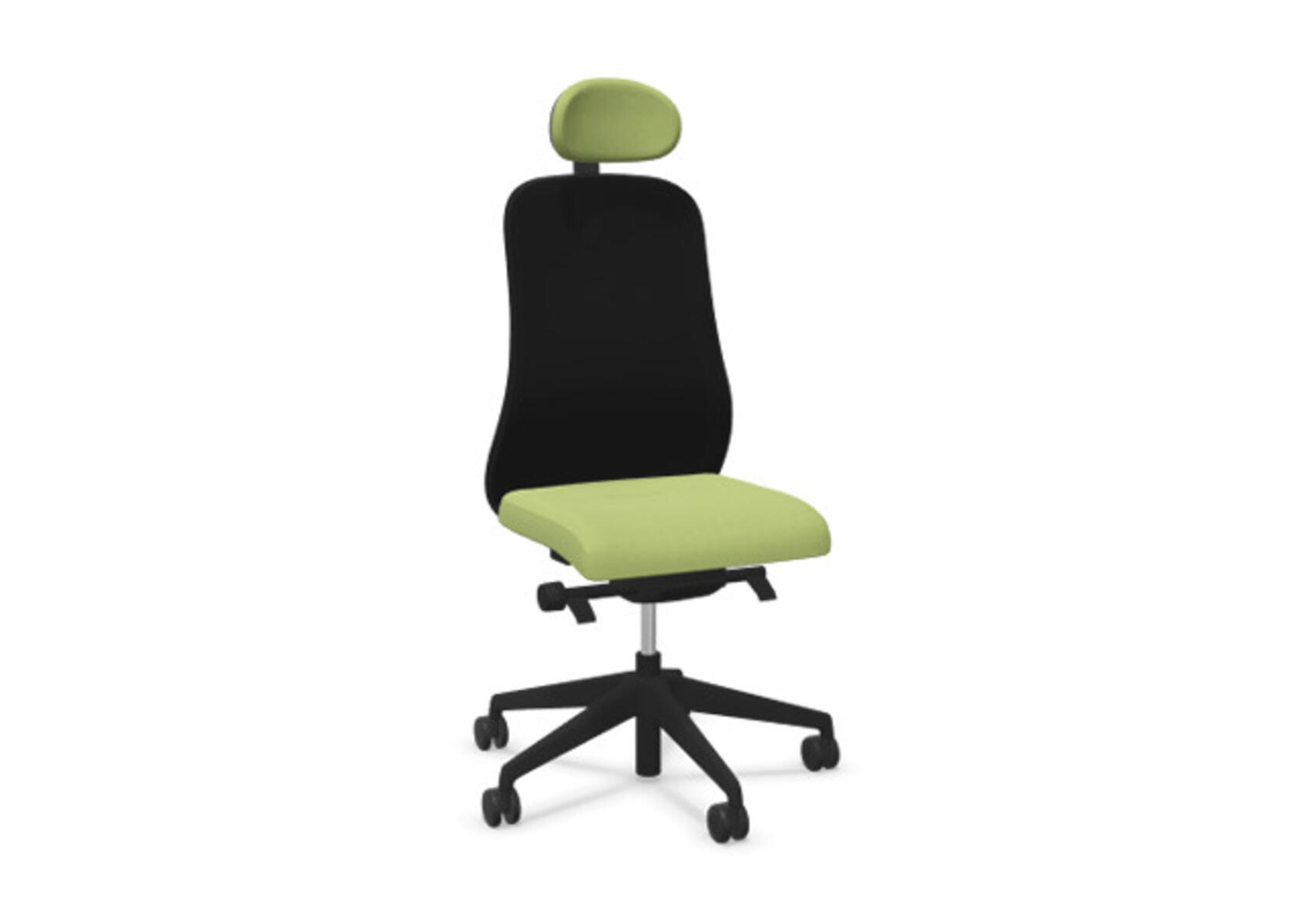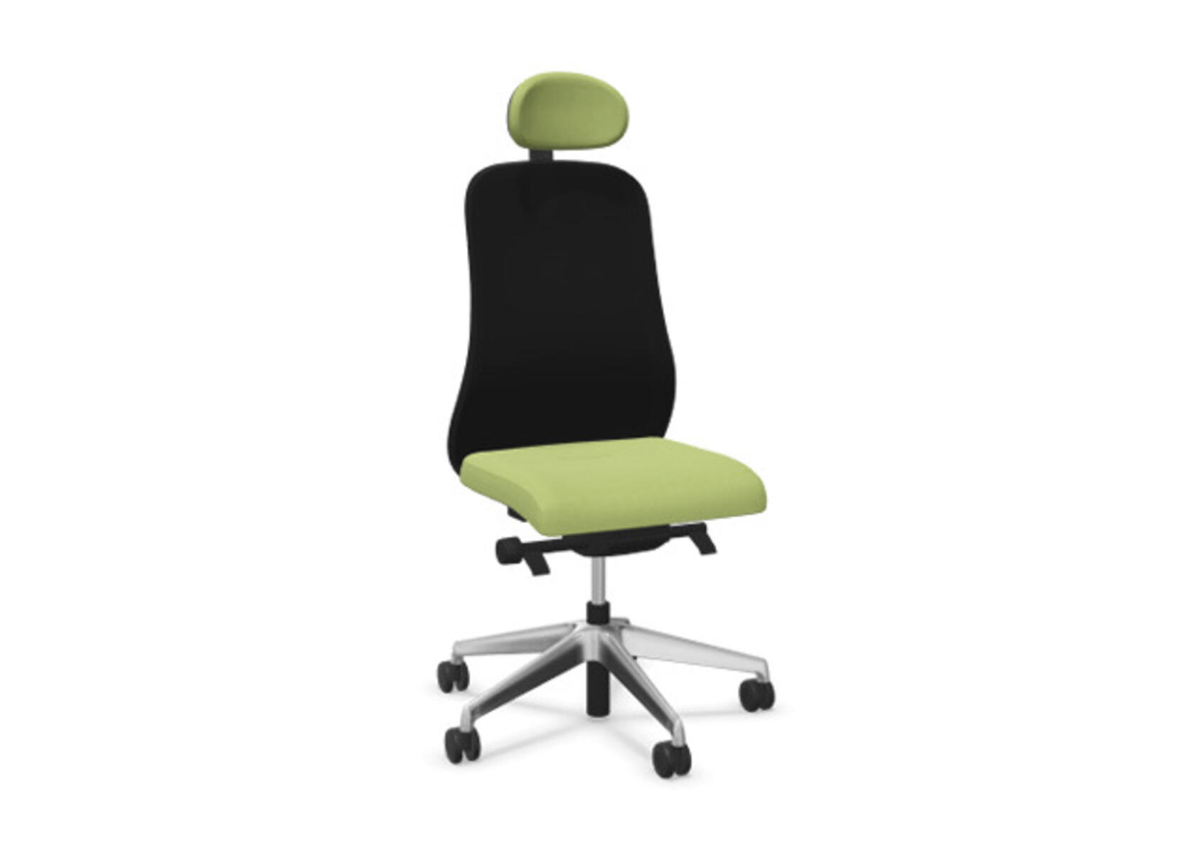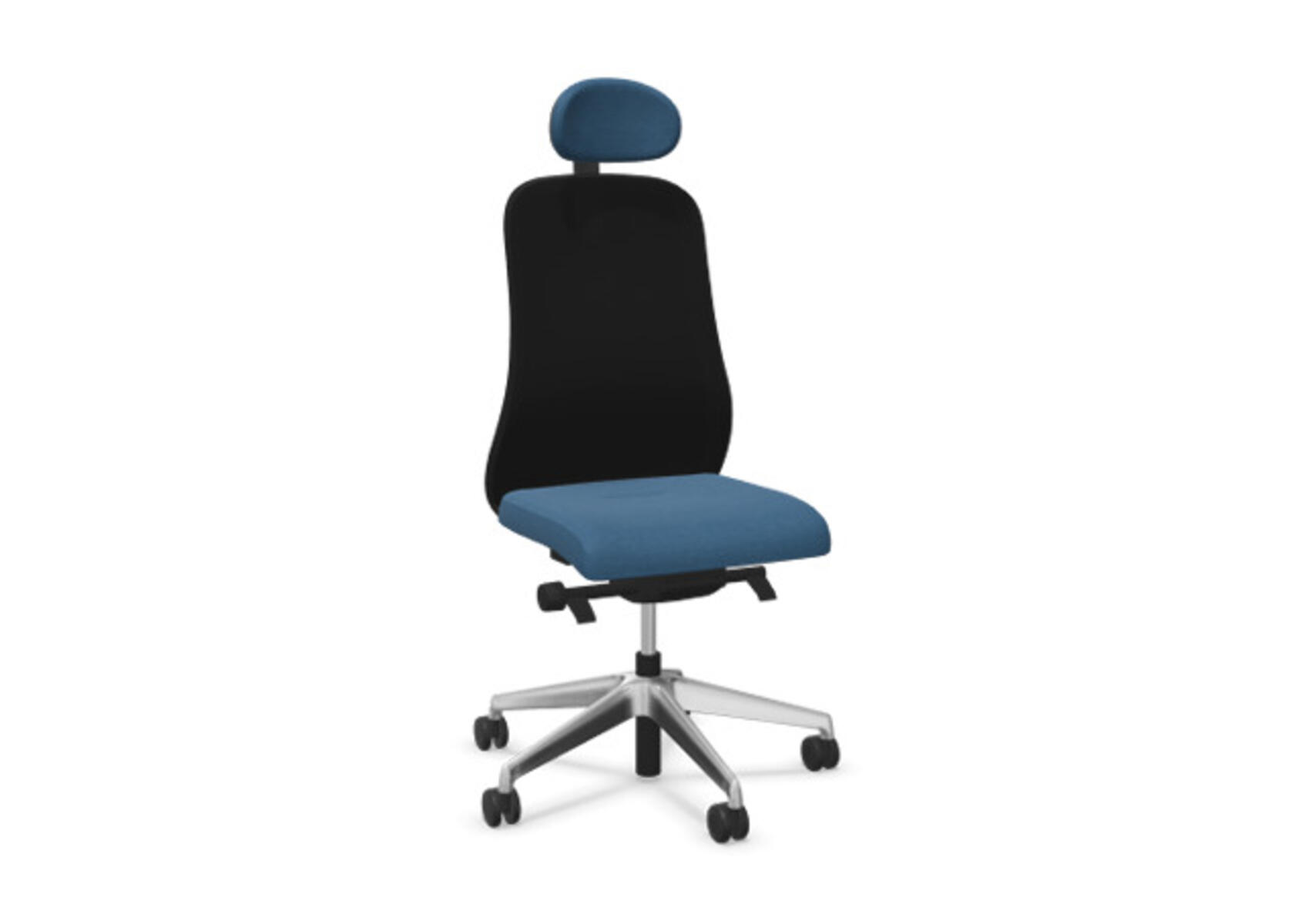 Moderni ja ergonominen toimistotuoli, jossa verhoiltu selkänoja, kehittynyt synkromekanismi ja istuinsyvyyden säätö, tarjoen optimaalisen tuen aktiiviseen istumiseen koko työpäivän ajan. Verhoiltu polyesterikankaalla. Synkronoitu selkänojan ja istuimen kallistus mahdollistaa aktiivisen ja mukavan istuma-asennon. Selkänojan kallistuskulma 23° synkronoitu istuimen 10° kallistuskulman kanssa. Selkänoja lukittavissa 5 eri asentoon mahdollistaen yksilöllisen säädön, ja sen vastusta voi säätää helposti säätönupilla, 7 eri kohtaan. Ei selkänojan korkeussäätöä. Istuinsyvyyden säätö 60 mm, 7 lukitusasentoa. Negatiivinen istuinkulma –2°, synkronoitu selkänojan 5° kallistukseen, mikä takaa optimaalisen tuen kaikissa kallistusasennossa. Selkänojassa on Anti-Shock-toiminto, joka estää selkänojaa palautumasta äkillisesti, kun kallistus vapautetaan. Verhoiltu niskatuki, säädettävä: syvyys 20 mm, kulma 70° ja korkeus 100 mm. Valitse ristikko vaaleanharmaasta polyamidista tai kiillotetusta alumiinista sekä itsestään jarruttavat pyörät pehmeille tai koville lattioille. Lisävarusteena saatavilla lannerangan tuki, manuaalisesti säädettävä korkeussuunnassa (55 mm). Käsinojat (2D, 3D tai 4D) myydään erikseen.