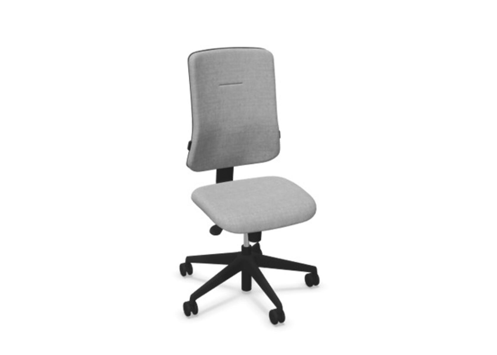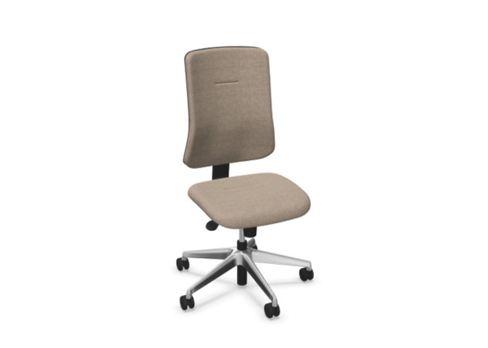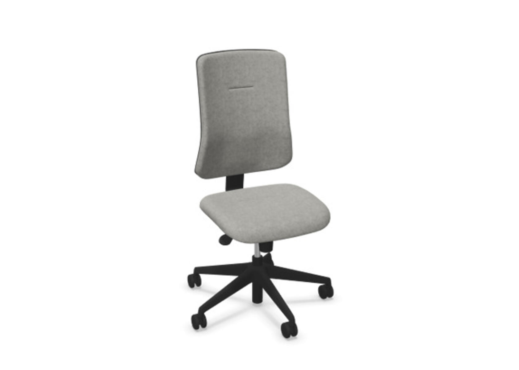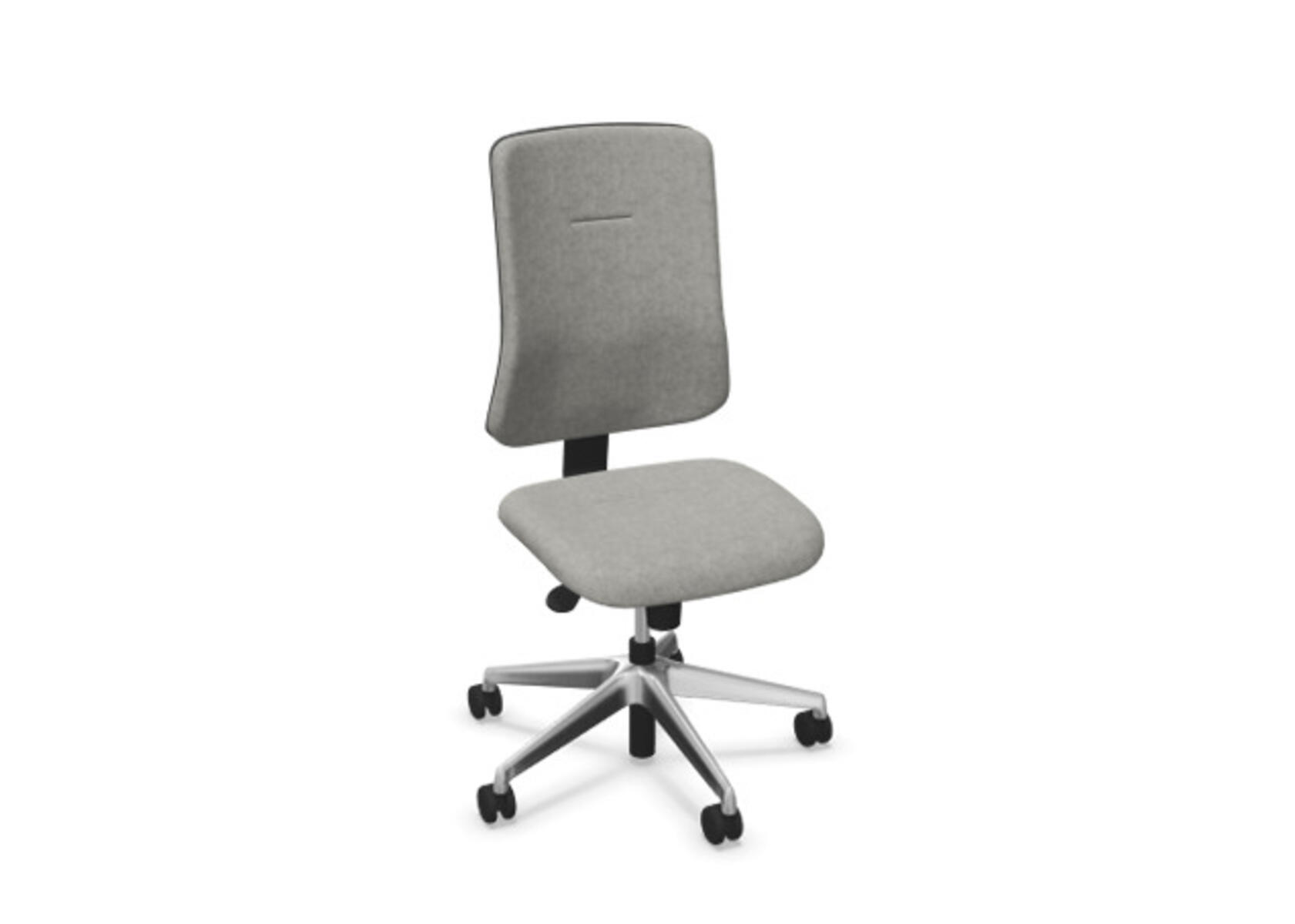 Ergonominen toimistotuoli, jossa verhoiltu selkänoja. Edistynyt synkronimekanismi takaa aktiivisen ja mukavan istuma-asennon koko työpäivän ajan. Verhoiltu polyesterikankaalla. Synkronoitu selkänojan ja istuimen kallistus mahdollistaa aktiivisen ja mukavan istuma-asennon. Selkänojan kallistuskulma 20° synkronoitu istuimen 11° kallistuskulman kanssa. Selkänoja lukittavissa 5 asentoon, selkänojan vastus säädettävissä säätönupilla. Selkänoja on korkeussäädettävä 70 mm ja lukittavissa 5 eri asentoon. Verhoiltu niskatuki, säädettävä: syvyys 20 mm, kulma 70° ja korkeus 100 mm. Selkänojassa on Anti-Shock-toiminto, joka estää selkänojaa palautumasta äkillisesti, kun kallistus vapautetaan. Valitse ristikko vaaleanharmaasta polyamidista tai kiillotetusta alumiinista sekä itsestään jarruttavat pyörät pehmeille tai koville lattioille. Lisävarusteena saatavilla lannerangan tuki, manuaalisesti säädettävä syvyyssuunnassa (15 mm) ja korkeussuunnassa (20 mm). Käsinojat (2D, 3D tai 4D) myydään erikseen.