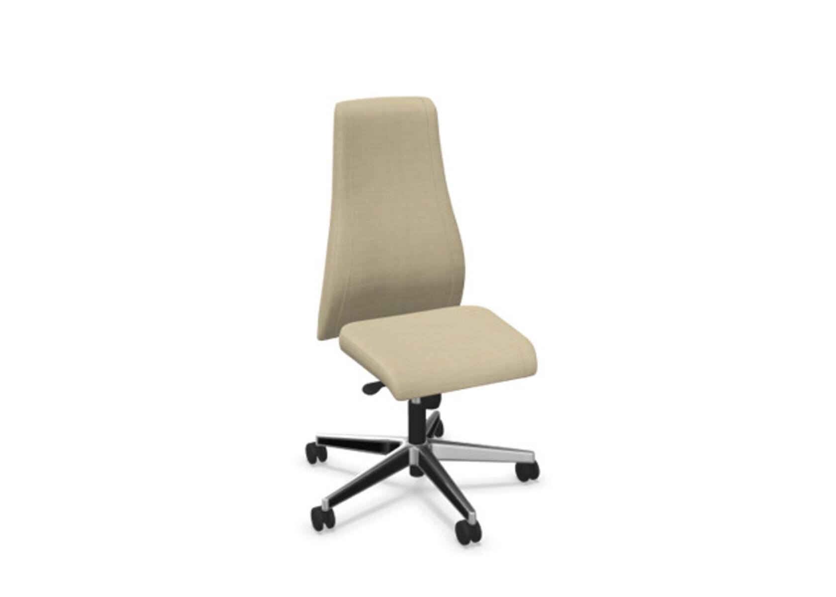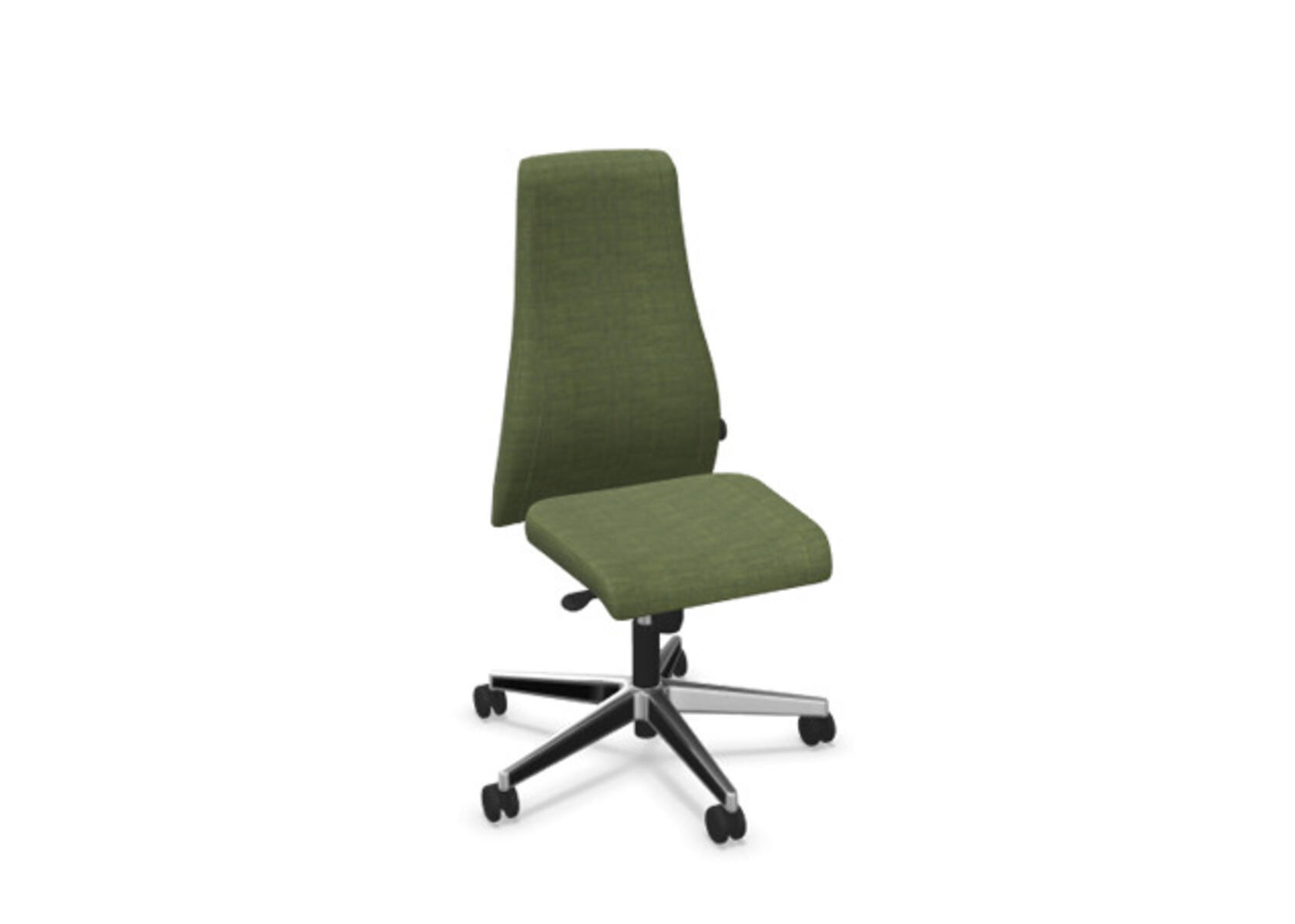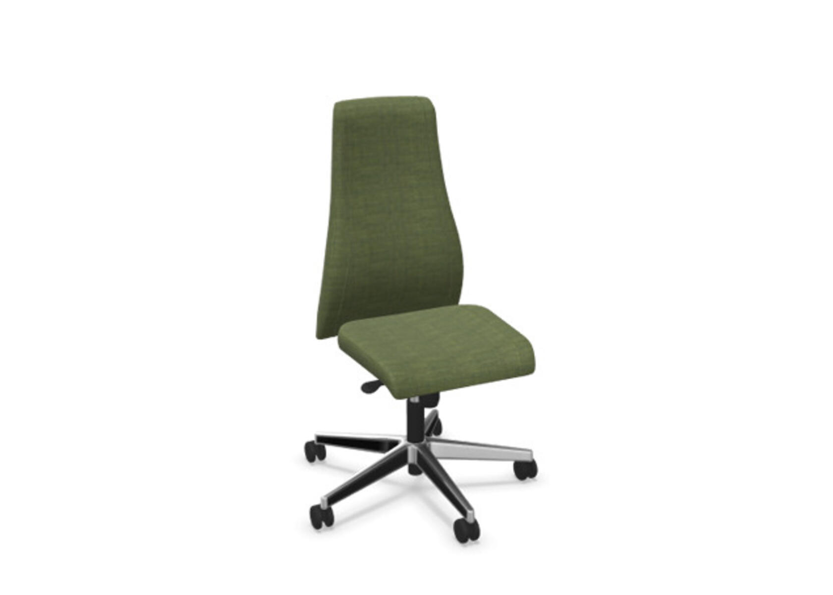 Tyylikäs ja ergonominen toimistotuoli, jossa ympäriverhoiltu korkea selkänoja. Synkronimekanismi tarjoaa optimaalista tukea aktiiviseen istumiseen koko työpäivän ajan. Verhoiltu villakankaalla. Synkronoitu selkänojan ja istuimen kallistus mahdollistaa aktiivisen ja mukavan istuma-asennon. Selkänojan kallistuskulma 20° synkronoitu istuimen 11° kulmaan. Selkänoja lukittavissa 5 eri asentoon, mahdollistaen yksilöllisen säädön, ja vastusta voi säätää helposti säätönupilla. Selkänoja on korkeussäädettävä 70 mm ja lukittavissa 13 eri asentoon. Tuolissa on Anti-Shock-toiminto, joka estää selkänojaa palautumasta äkillisesti, kun kallistuslukitus vapautetaan. Valittavissa musta polyamidinen tai kiillotettu alumiiniristikko sekä itsestään jarruttavat pyörät pehmeille tai koville lattioille. Lisävarusteena saatavilla lannerangan tuki, joka on manuaalisesti säädettävissä syvyyssuunnassa (20 mm) säätönupin avulla. Käsinojat (2D, 3D tai 4D) myydään erikseen.