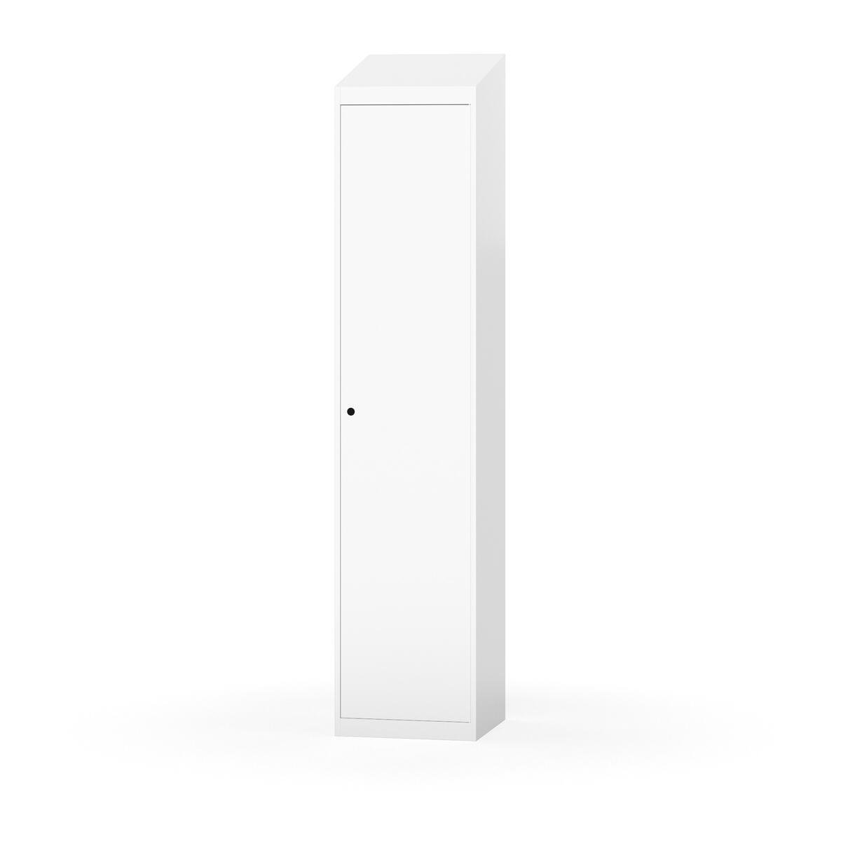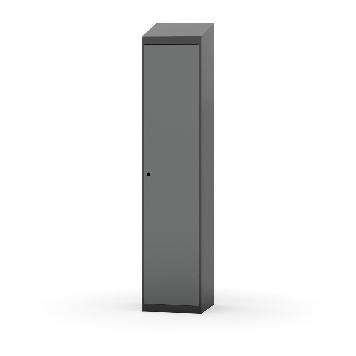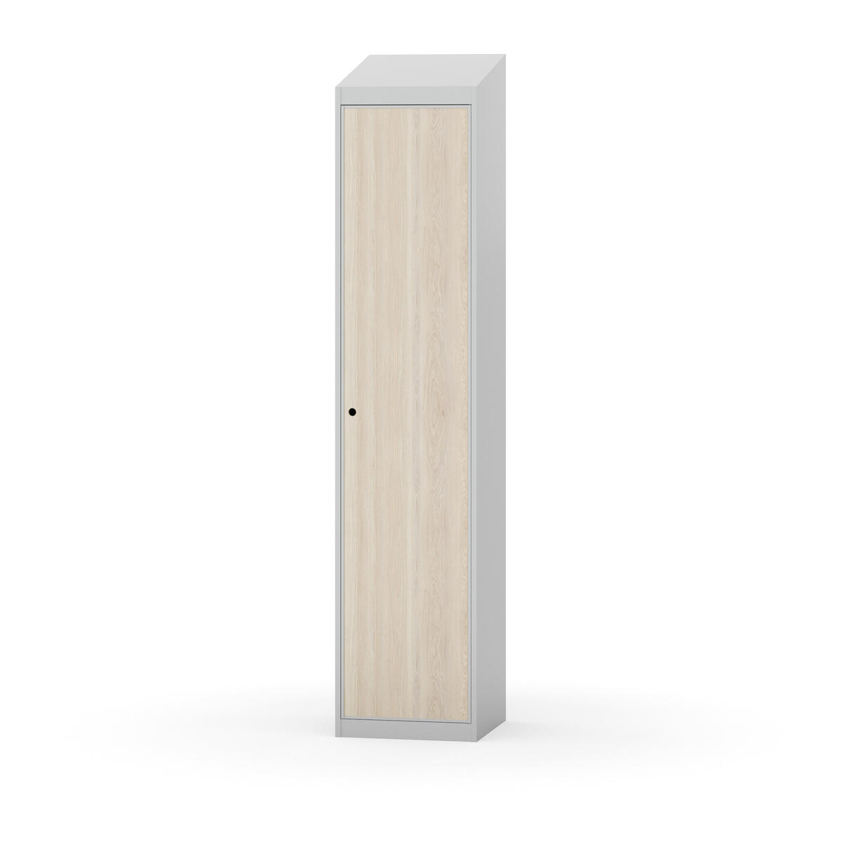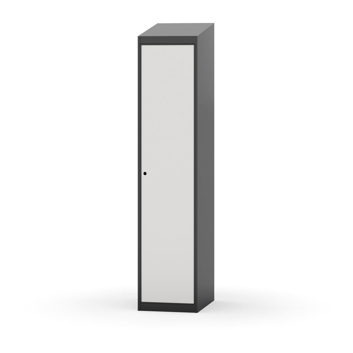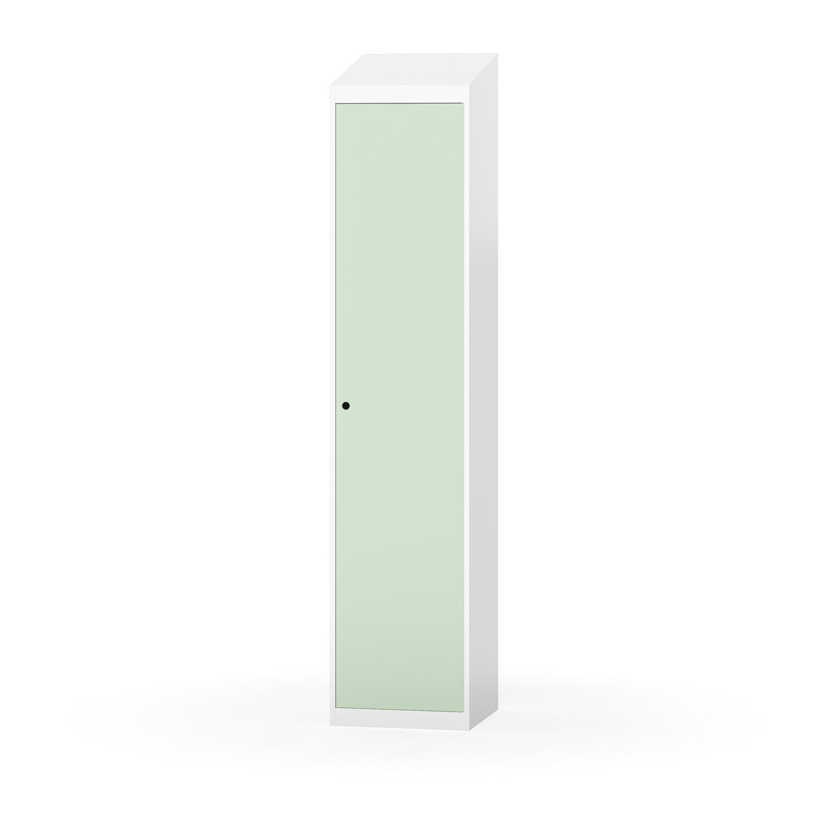 Täysin hitsattu runko. Valittavana pelti- tai korkeapainelaminaattipintainen ovi. Peltiovessa on pysäytin sekä teräsvahvike lukkoreiän ympärillä. Laminaattiovessa on teräskehys ja teräksinen pysäytin. Ovet aukeavat 90°. Sisällä on hylly ja vaatetanko kahdella kaksoiskoukulla. Kaapissa on tasainen pohja ilman kynnystä. Ilmastointireiät pohjassa ja katossa. Lukot ja sokkeli/jalusta tilataan erikseen omilla tuotenumeroillaan. Lukot tulevat asennettuna, sokkeli/jalusta asennetaan toimituksen yhteydessä.