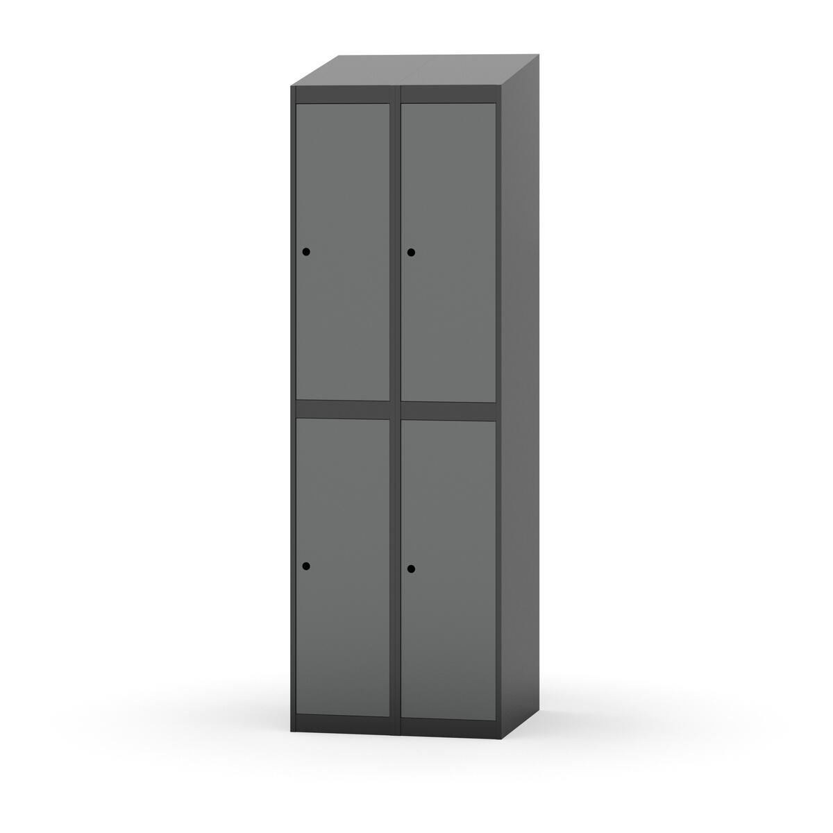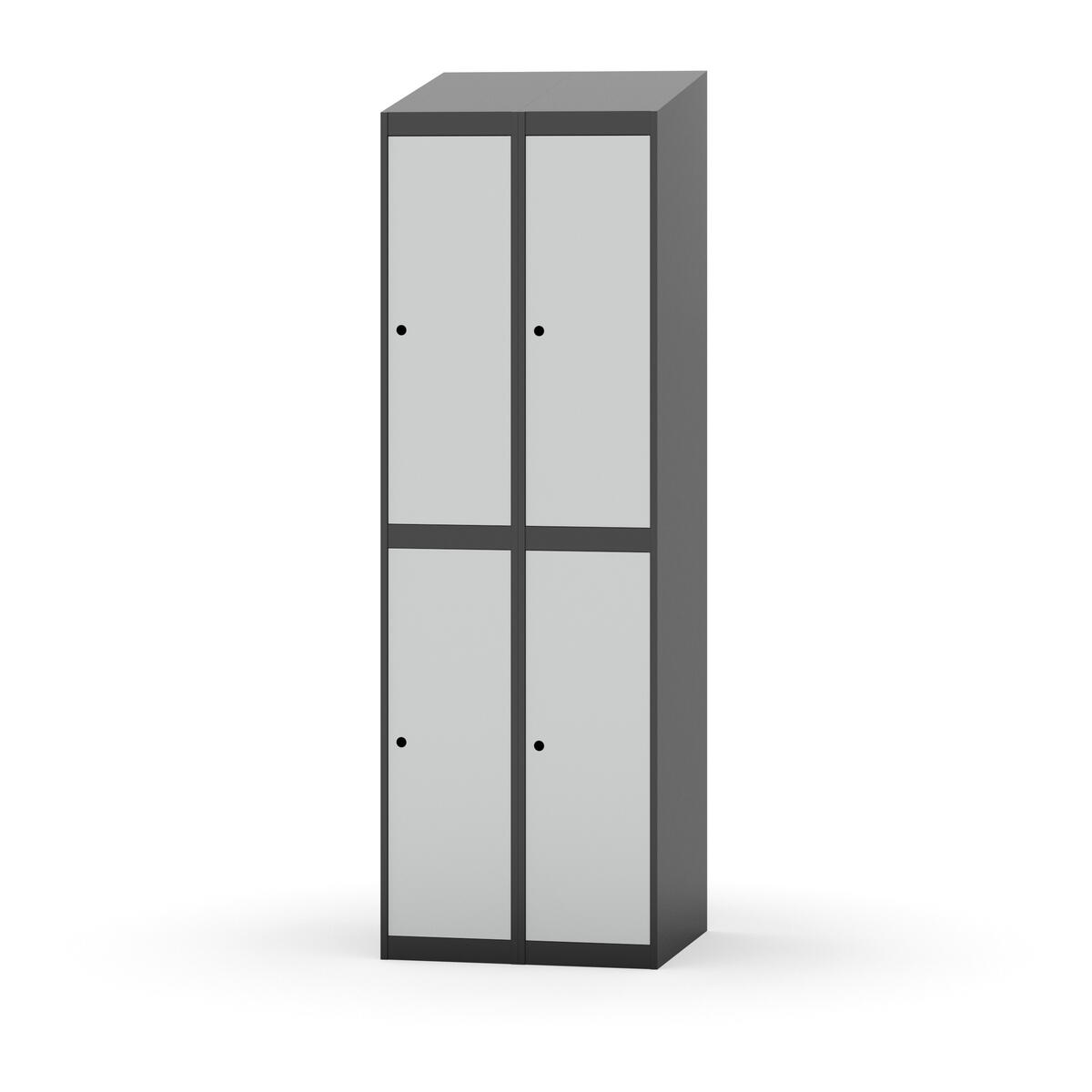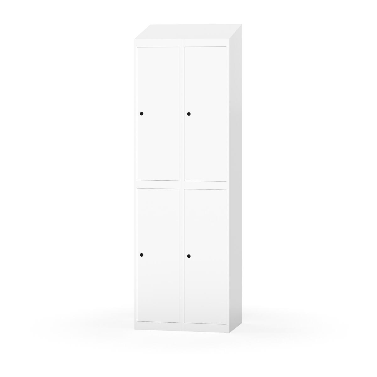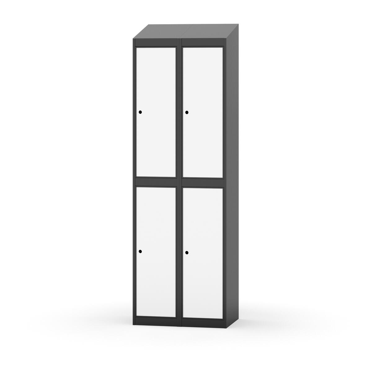Täysin hitsattu runko. Valittavana pelti- tai korkeapainelaminaattipintainen ovi. Peltiovessa on pysäytin sekä teräsvahvike lukkoreiän ympärillä. Laminaattiovessa on teräskehys ja teräksinen pysäytin. Ovet aukeavat 90°. Sisällä on hylly ja vaatetanko kahdella kaksoiskoukulla. Kaapissa on tasainen pohja ilman kynnystä. Ilmastointireiät pohjassa ja katossa. Lukot ja sokkeli/jalusta tilataan erikseen omilla tuotenumeroillaan. Lukot tulevat asennettuna, sokkeli/jalusta asennetaan toimituksen yhteydessä.