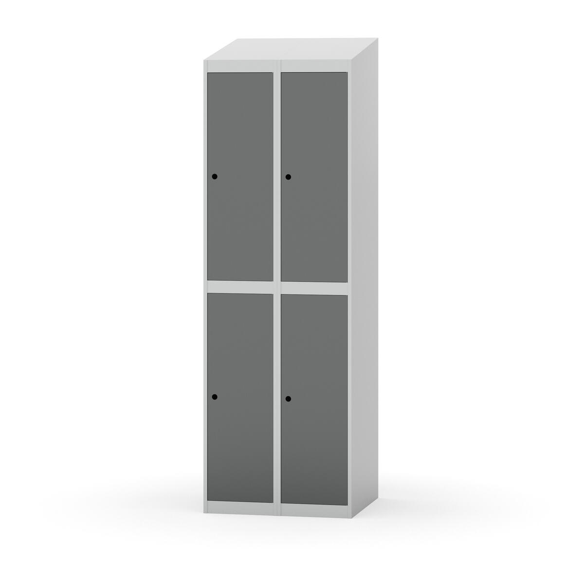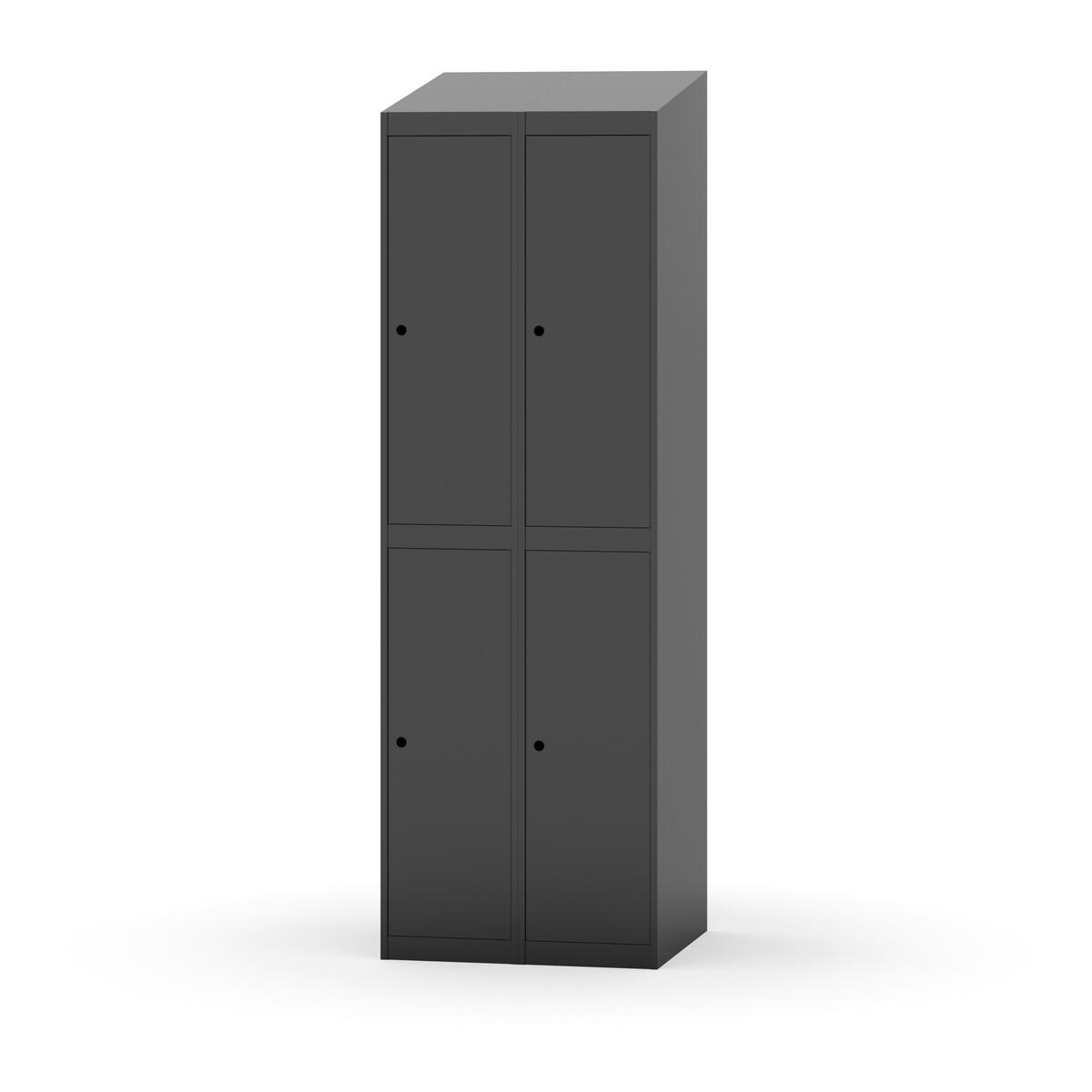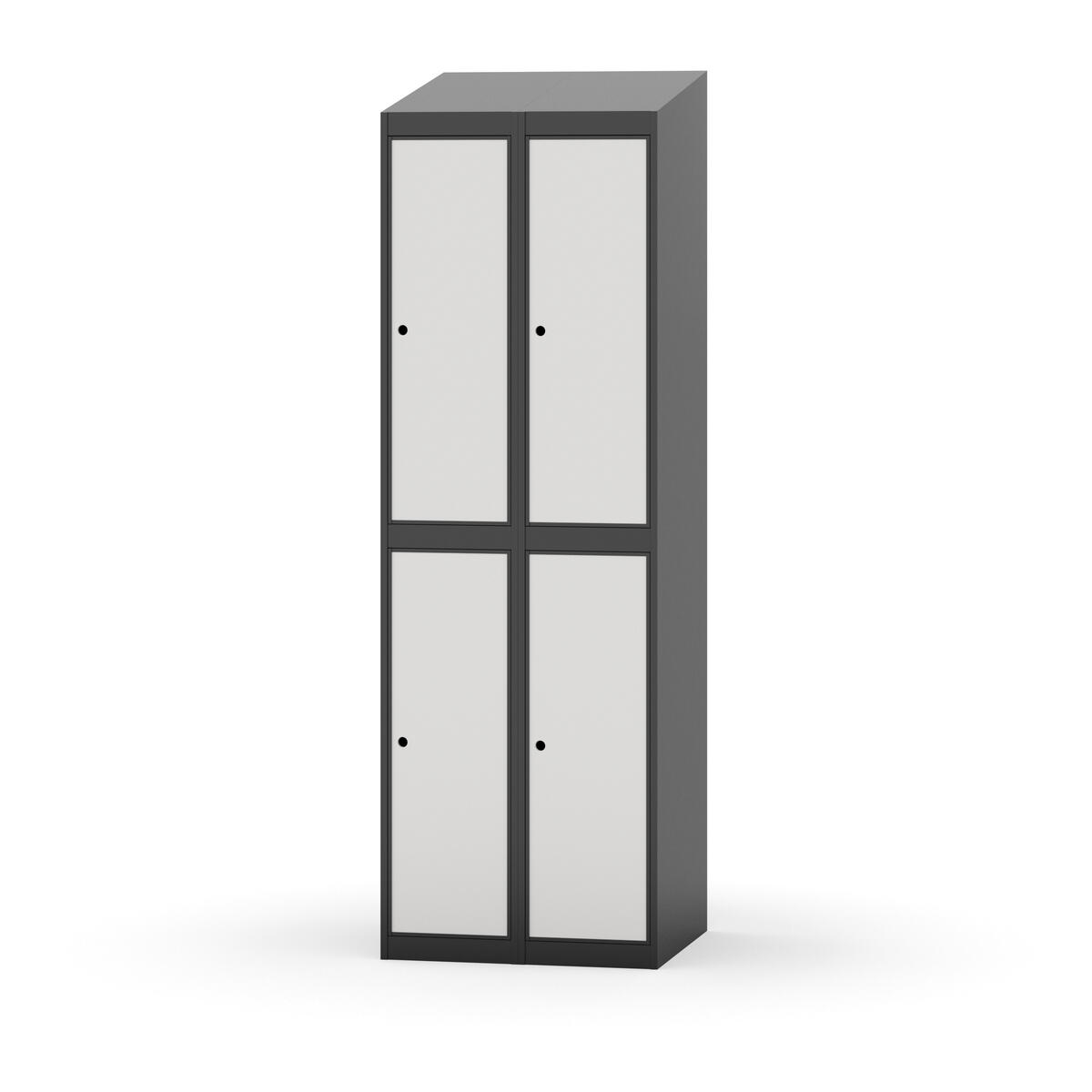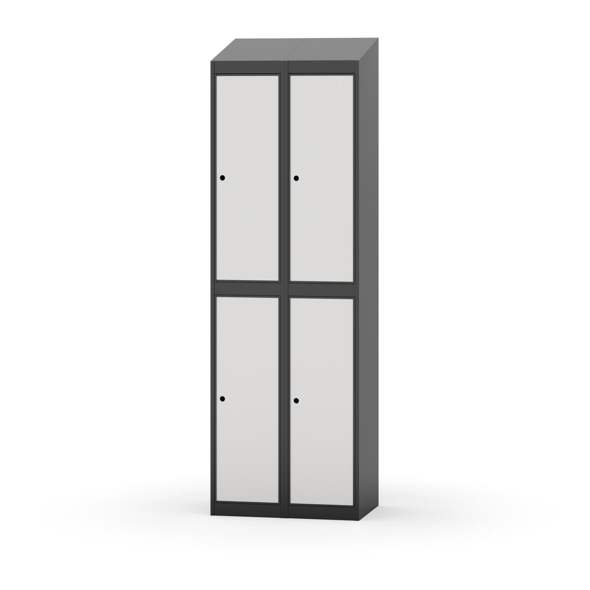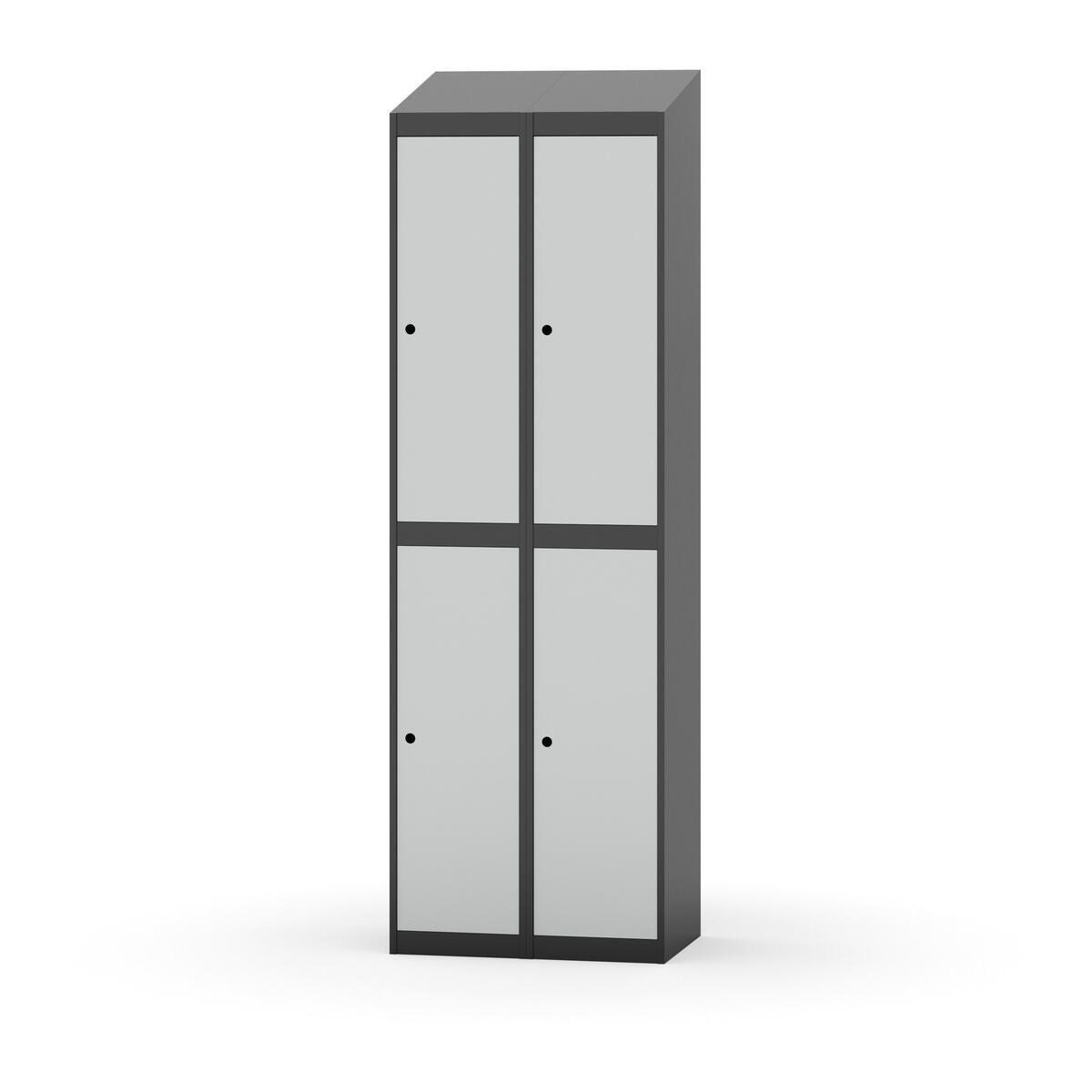 Täysin hitsattu runko. Valittavana pelti- tai korkeapainelaminaattipintainen ovi. Peltiovessa on pysäytin sekä teräsvahvike lukkoreiän ympärillä. Laminaattiovessa on teräskehys ja teräksinen pysäytin. Ovet aukeavat 90°. Sisällä on hylly ja vaatetanko kahdella kaksoiskoukulla. Kaapissa on tasainen pohja ilman kynnystä. Ilmastointireiät pohjassa ja katossa. Lukot ja sokkeli/jalusta tilataan erikseen omilla tuotenumeroillaan. Lukot tulevat asennettuna, sokkeli/jalusta asennetaan toimituksen yhteydessä.