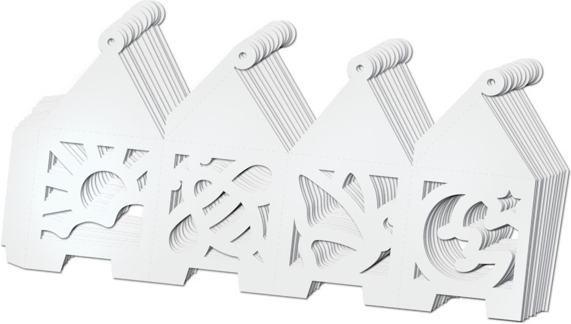 Valkoisesta pahvista valmistetut paperilyhdyt, maalausta ja koristelua varten. Lyhty toimitetaan kokoamattomana ja voidaan maalata ennen kokoamista. Helppo koota. Mitat: 9 x 14 cm.