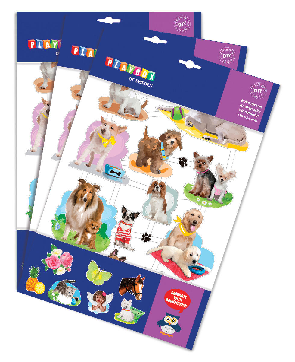 10 erilaista arkkia, yhteensä 130 kiiltokuvaa. Kuvissa enkeleitä, perhosia, kukkia, kissoja, koiria, hedelmiä, hevosia ja muita eläimiä. Paperia. Raaka-aine FSC-merkitty.