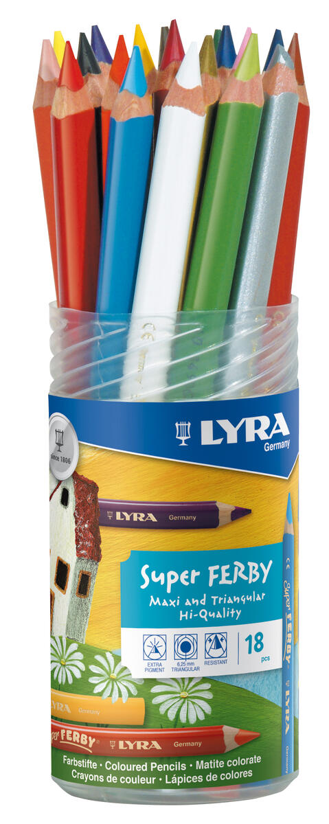 Lyra Super Ferby -värikynät, jotka on kehitetty yhdessä Waldorf-koulun kanssa. Kynissä on kirkkaat värit. Kolmikulmainen, lakkaamaton puuvarsi, Ø 10 mm, varren pituus 180 mm. Värilyijy Ø 6,25 mm.