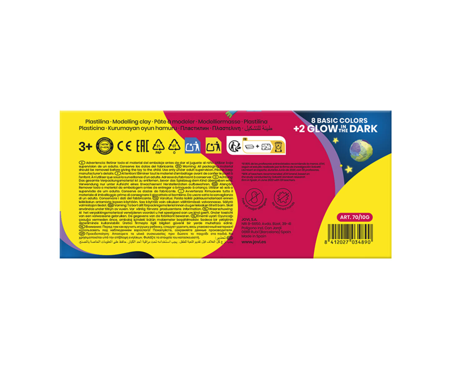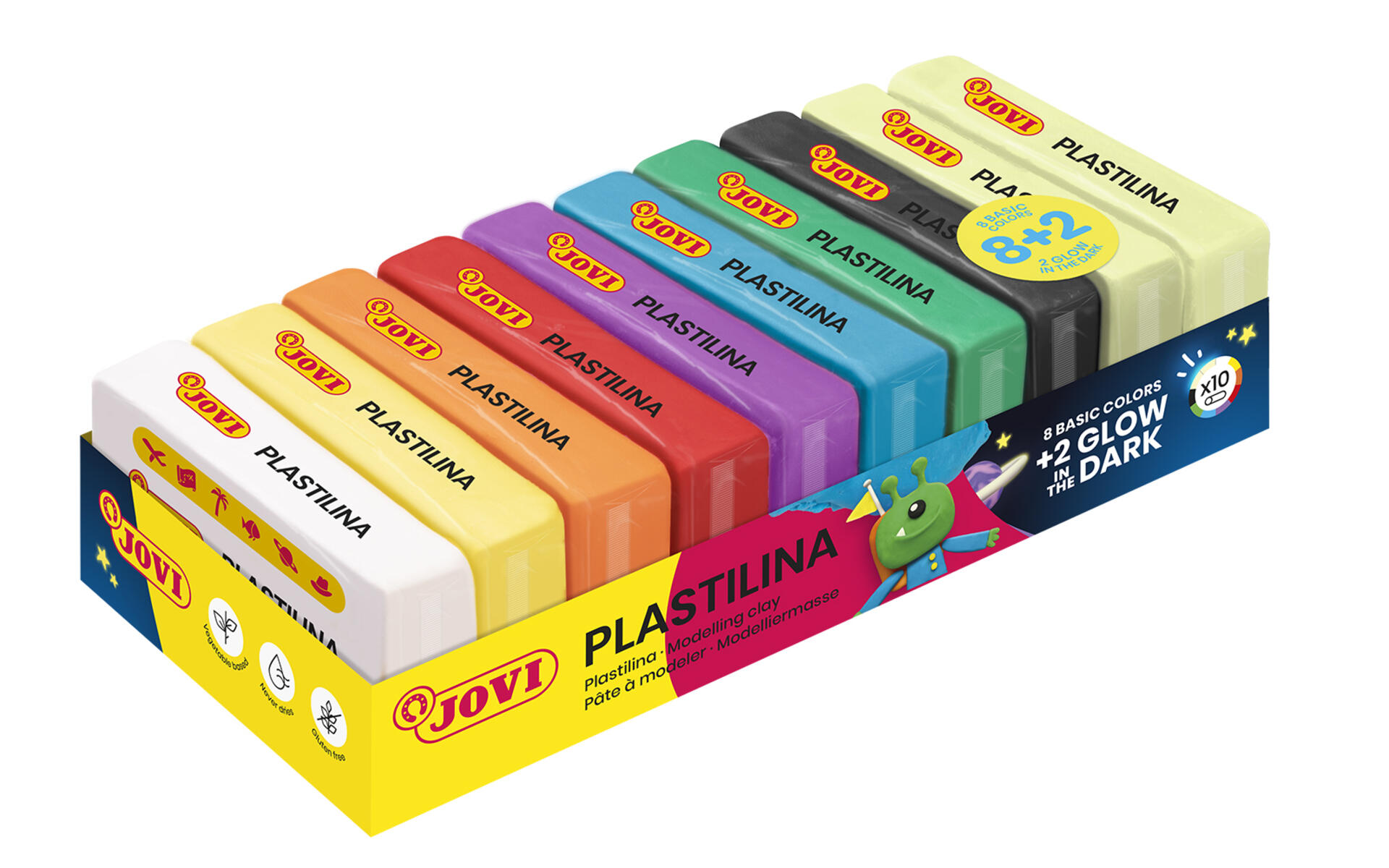 Pehmeä, helposti muovattava muovailuvaha, joka ei kuivu. Värejä voi sekoittaa. Ei tahraa ihoa, vaatteita tai työalustaa. Pakkaus sisältää värit: valkoinen, keltainen, oranssi, punainen, violetti, sininen, vihreä, musta ja 2 fluoresoivaa keltaista. Muovailuvaha ei sisällä gluteenia, soijaa eikä pähkinää. Yli 3-vuotiaille.